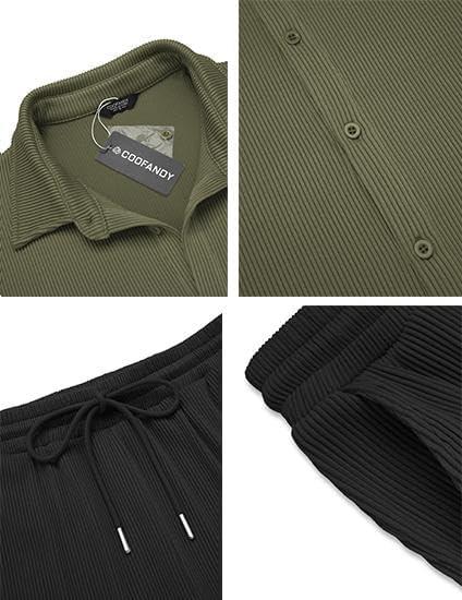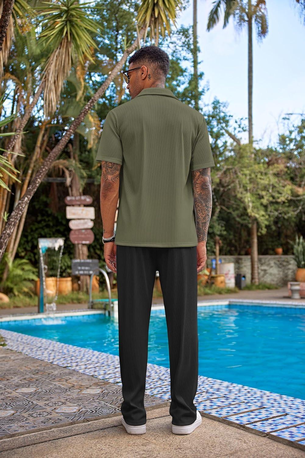 COOFANDY Men's 2 Piece Outfit Casual Short Sleeve Button Down Shirt Beach Summer Loose Pant Sets(Army Green Black)