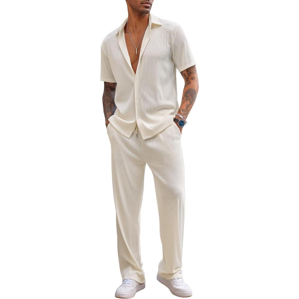 COOFANDY Men's 2 Piece Outfit Casual Short Sleeve Button Down Shirt Beach Summer Loose Pant Sets(Beige)