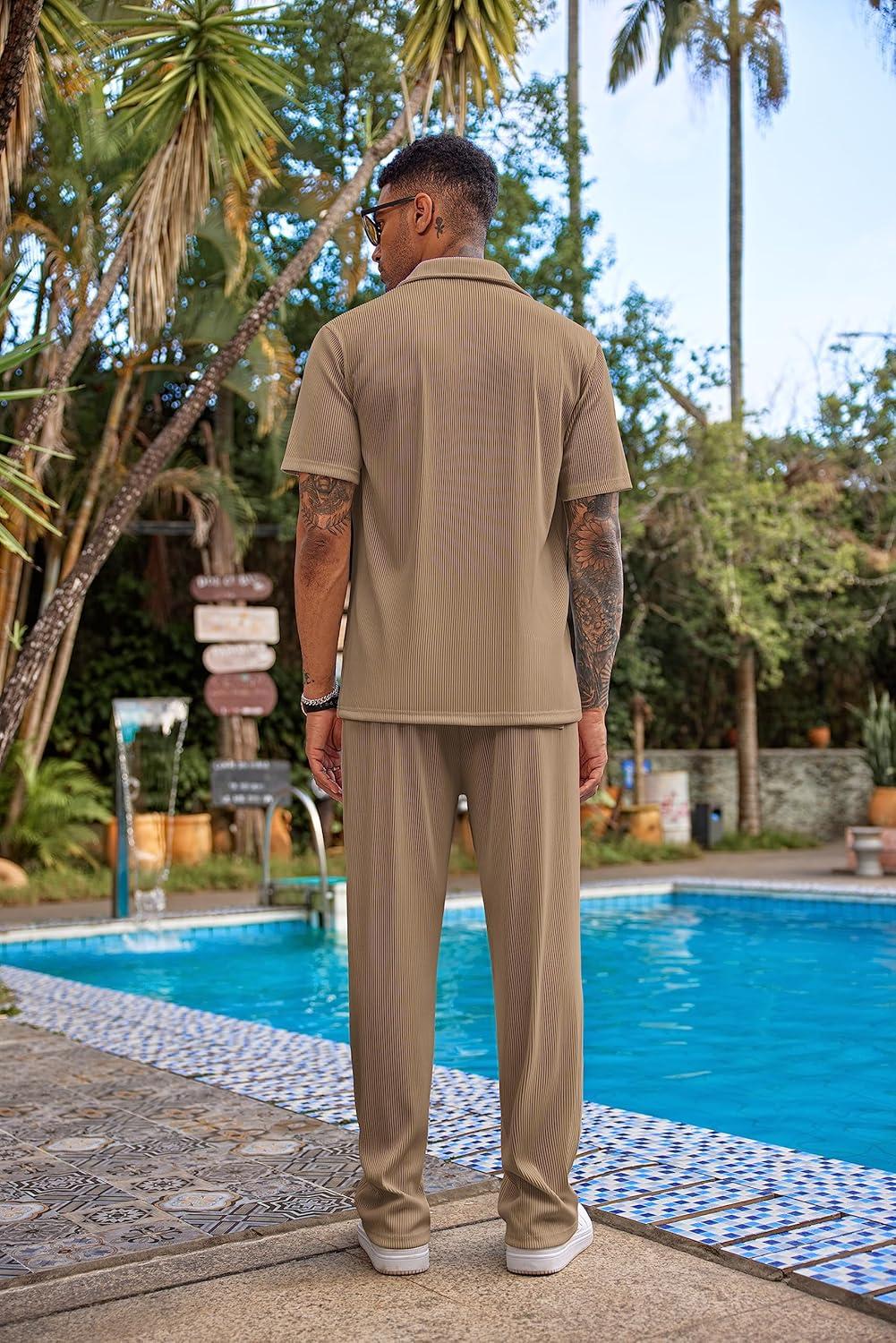 COOFANDY Men’s 2 Piece Outfit Casual Short Sleeve Button Down Shirt Beach Summer Loose Pant Sets(Brown)