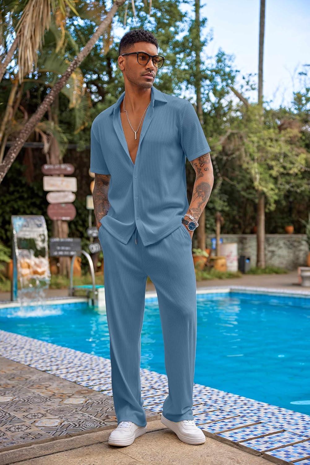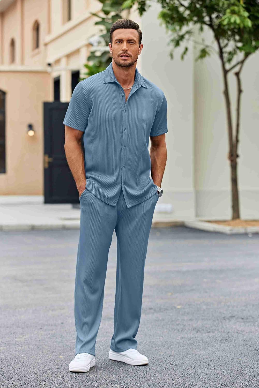 COOFANDY Men's 2 Piece Outfit Casual Short Sleeve Button Down Shirt Beach Summer Loose Pant Sets(Grey Blue)