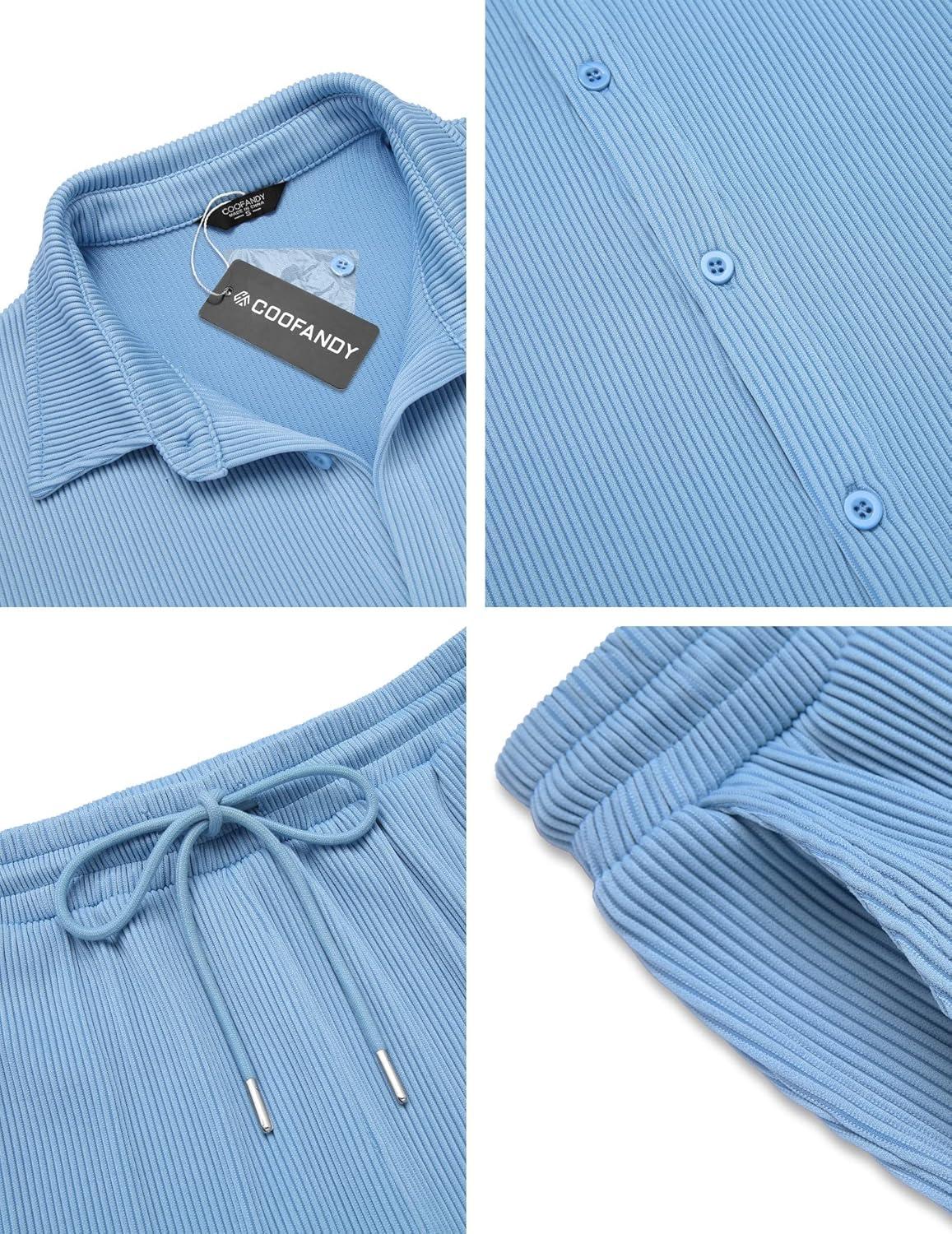 COOFANDY Men's 2 Piece Outfit Casual Short Sleeve Button Down Shirt Beach Summer Loose Pant Sets(Light Blue)