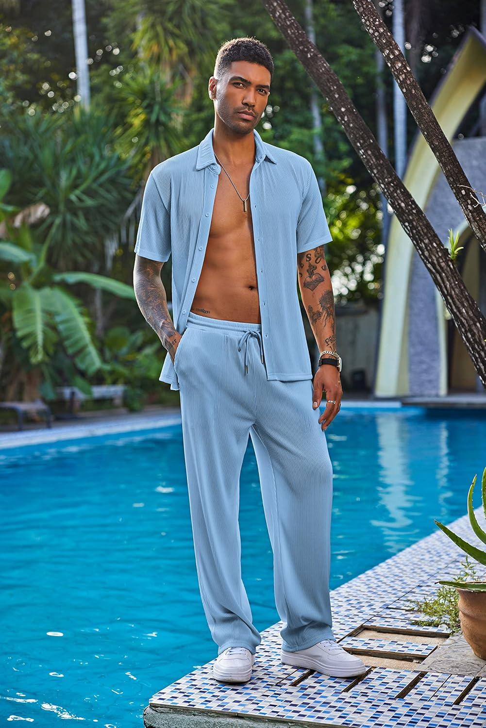 COOFANDY Men’s 2 Piece Outfit Casual Short Sleeve Button Down Shirt Beach Summer Loose Pant Sets(Light Blue)