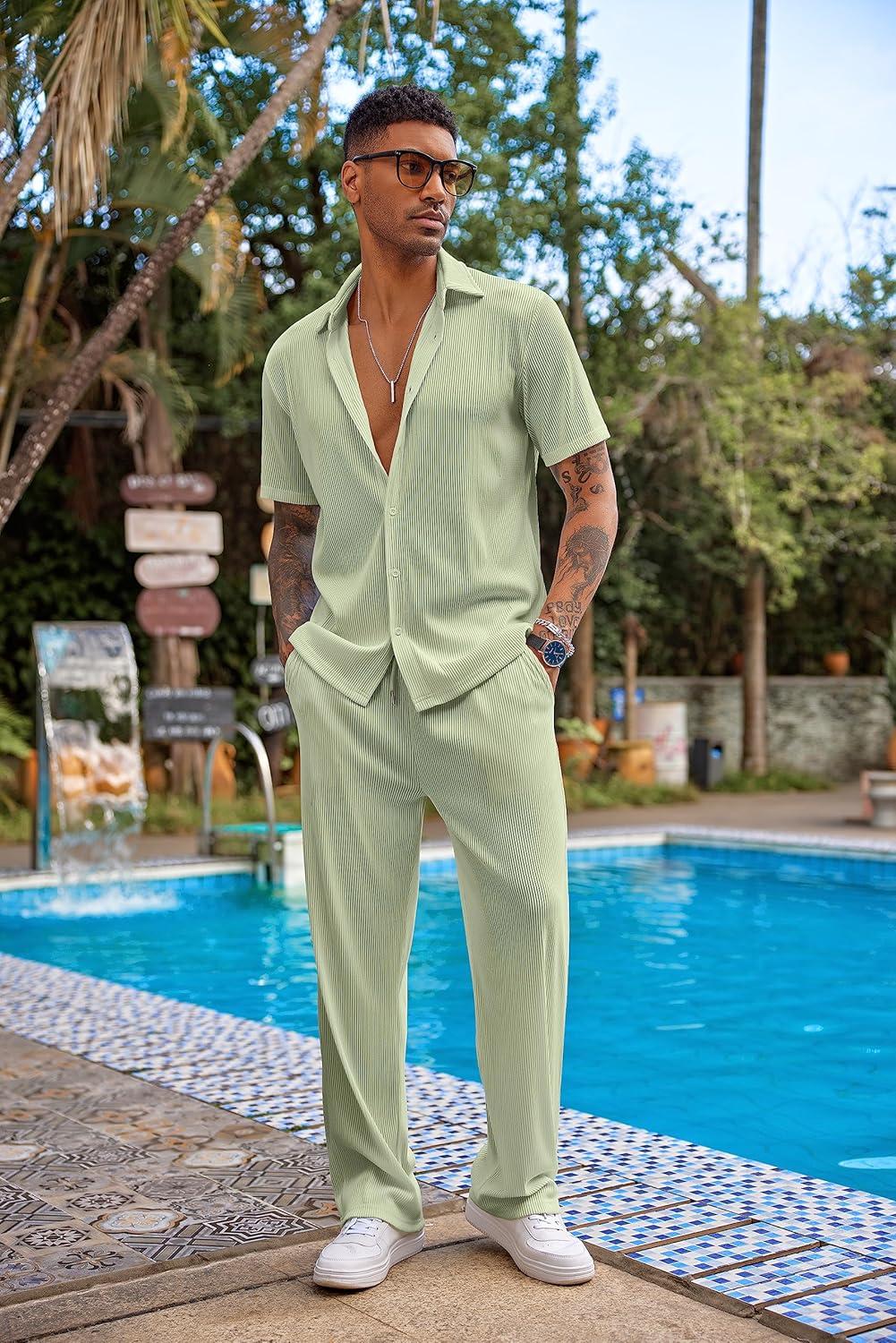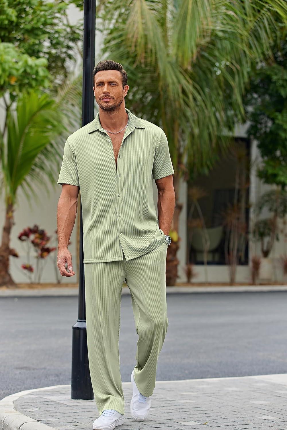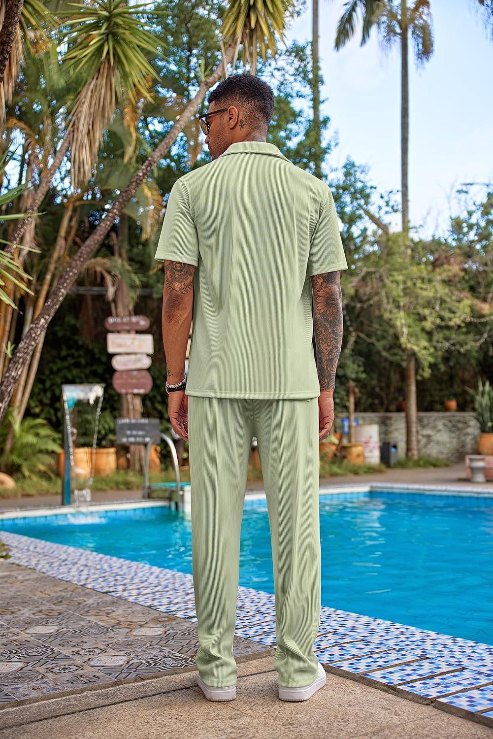COOFANDY Men’s 2 Piece Outfit Casual Short Sleeve Button Down Shirt Beach Summer Loose Pant Sets(Light Green)