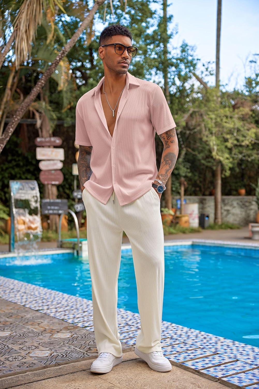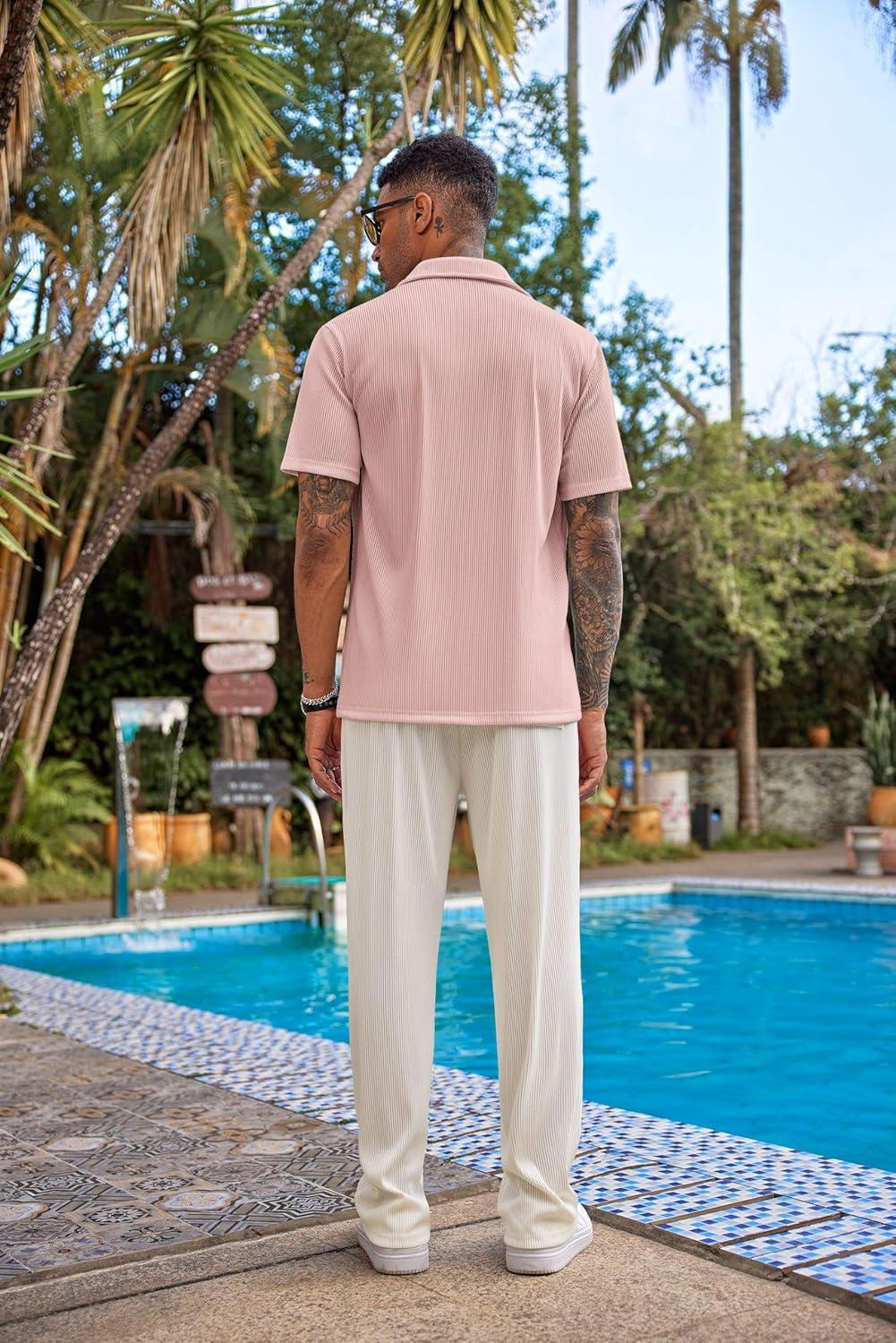 COOFANDY Men’s 2 Piece Outfit Casual Short Sleeve Button Down Shirt Beach Summer Loose Pant Sets(Light Pink)