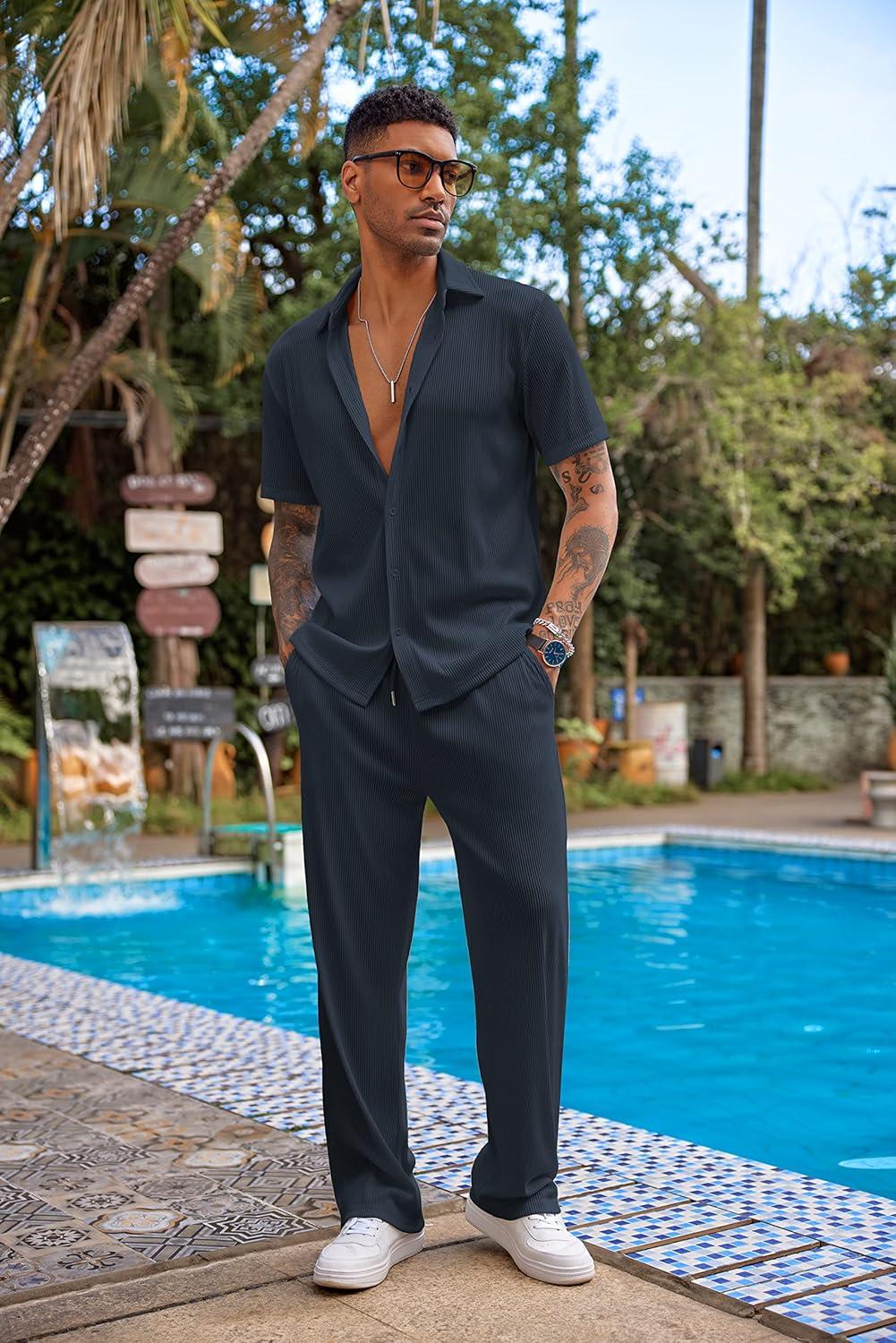 COOFANDY Men’s 2 Piece Outfit Casual Short Sleeve Button Down Shirt Beach Summer Loose Pant Sets(Navy Blue)