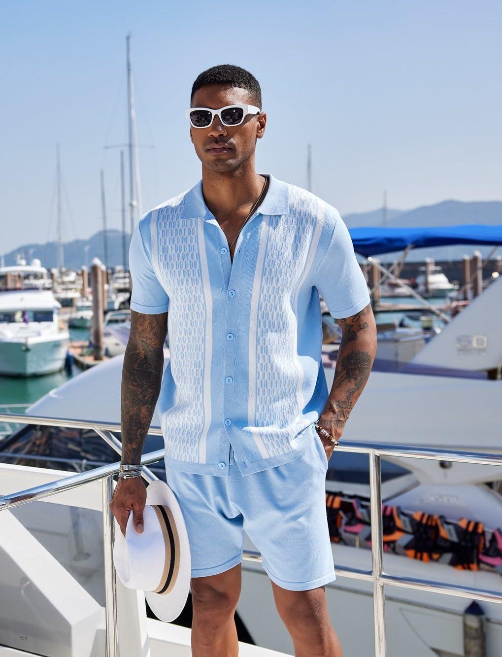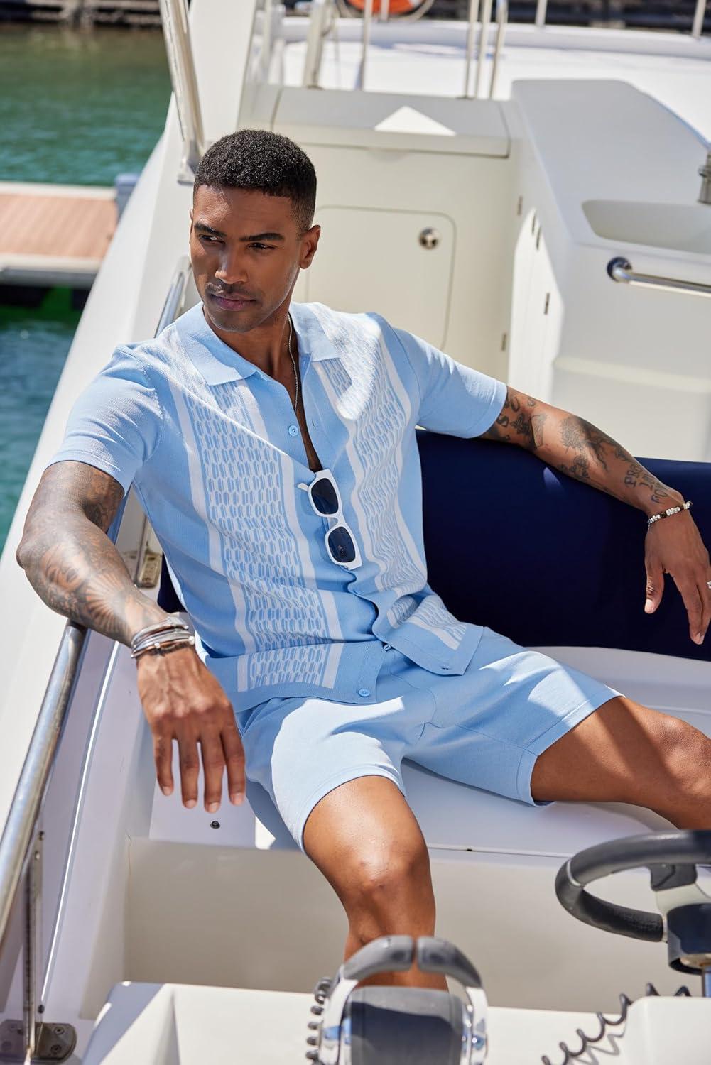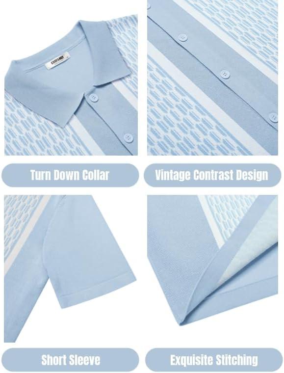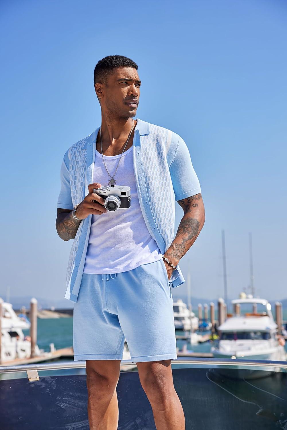 COOFANDY Men's 2 Piece Outfit Vintage Short Sleeve Button Down Knit Polo Shirts Casual Beach Shorts Sets(Blue)