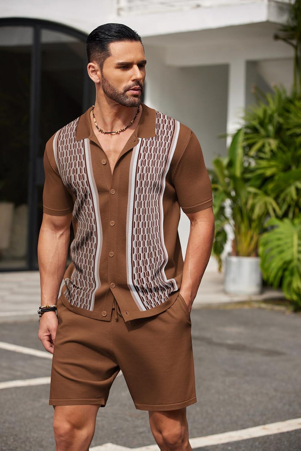 COOFANDY Men’s 2 Piece Outfit Vintage Short Sleeve Button Down Knit Polo Shirts Casual Beach Shorts Sets(Brown)