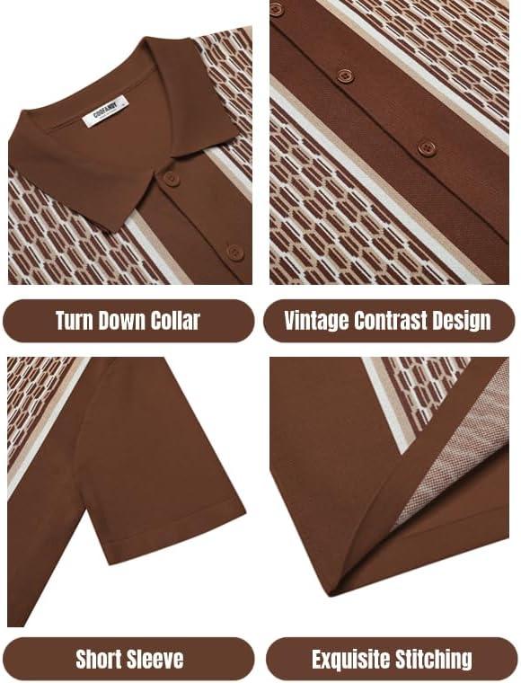 COOFANDY Men's 2 Piece Outfit Vintage Short Sleeve Button Down Knit Polo Shirts Casual Beach Shorts Sets(Brown)