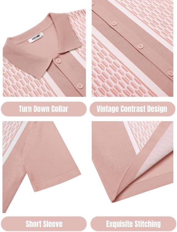 COOFANDY Men's 2 Piece Outfit Vintage Short Sleeve Button Down Knit Polo Shirts Casual Beach Shorts Sets(Pink)