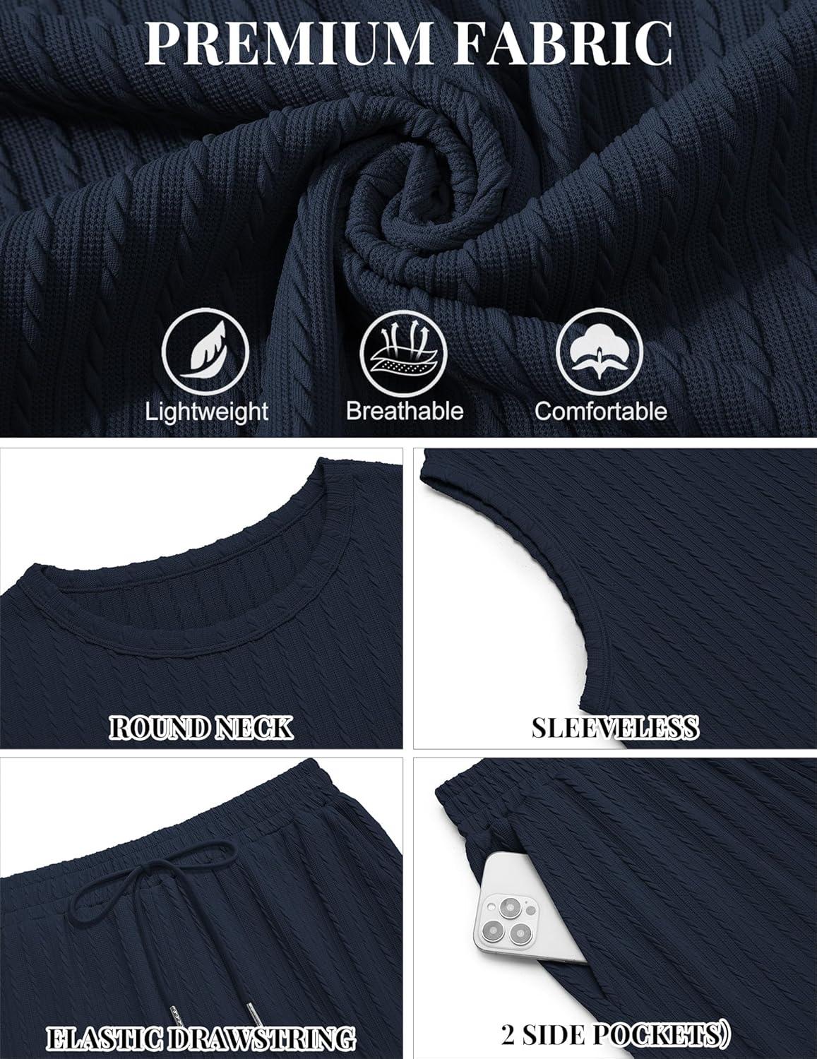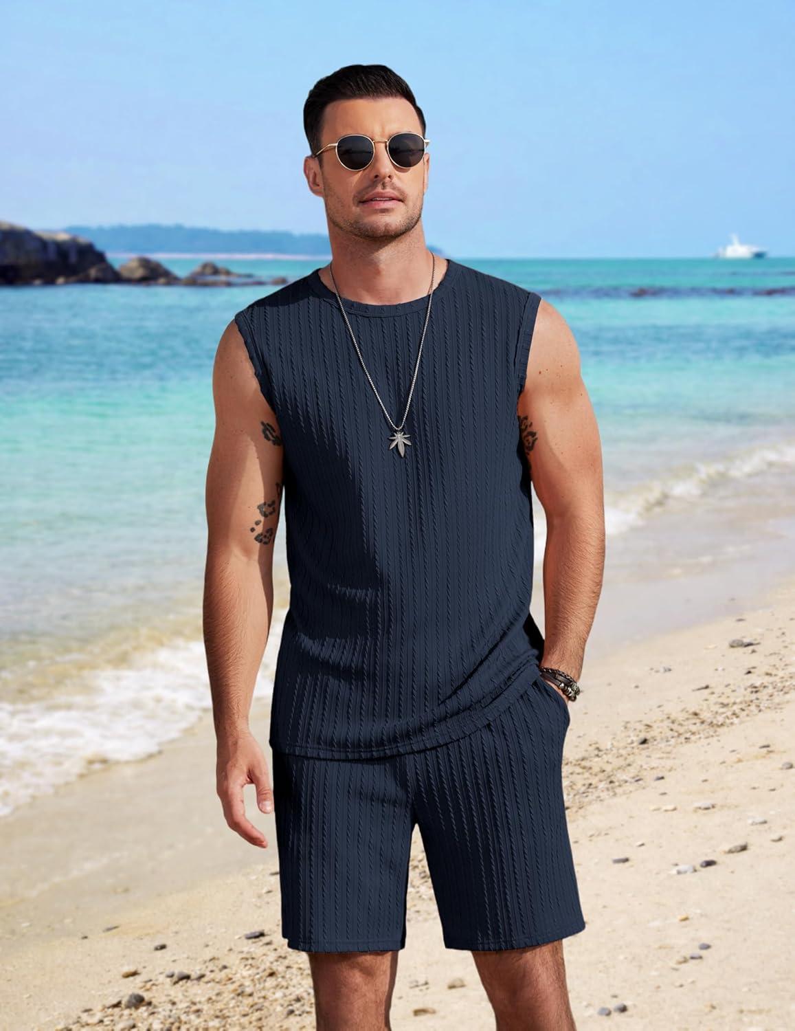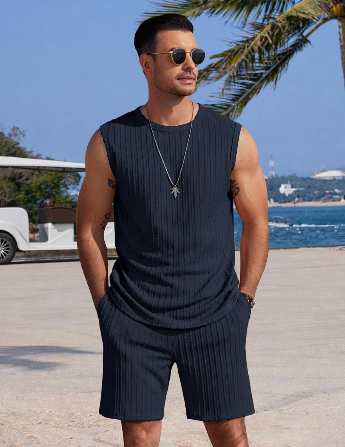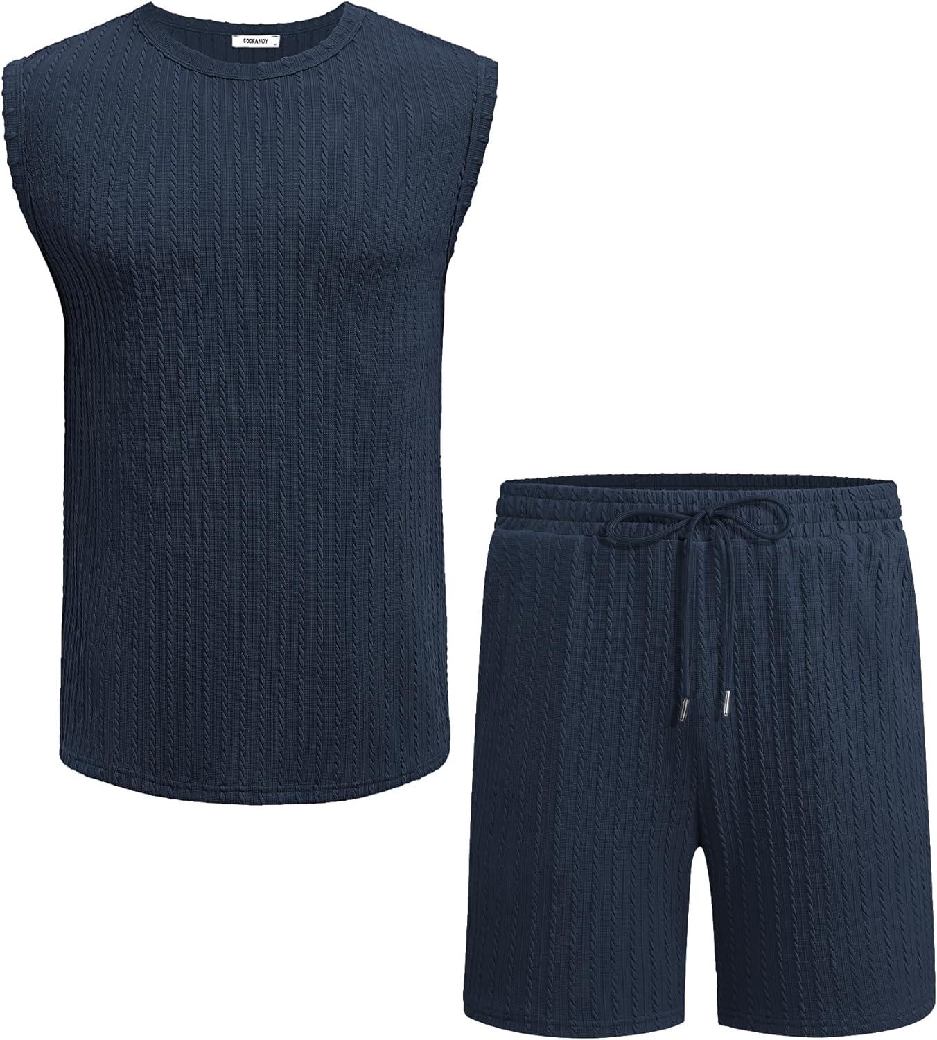 COOFANDY Men's 2 Piece Outfits Beach Knit Jacquard Sleeveless Shirt and Shorts Sets Summer Athletic Vacation Set(Navy Blue)