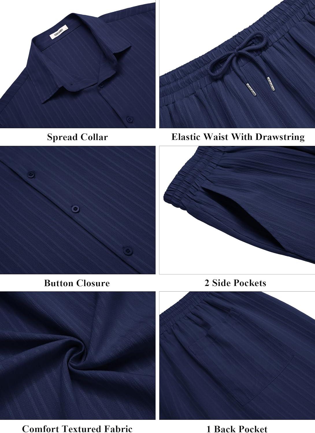 COOFANDY Mens 2 Piece Outfits Casual Summer Beach Textured Button Down Shirt Loose Pants Set(Navy Blue)