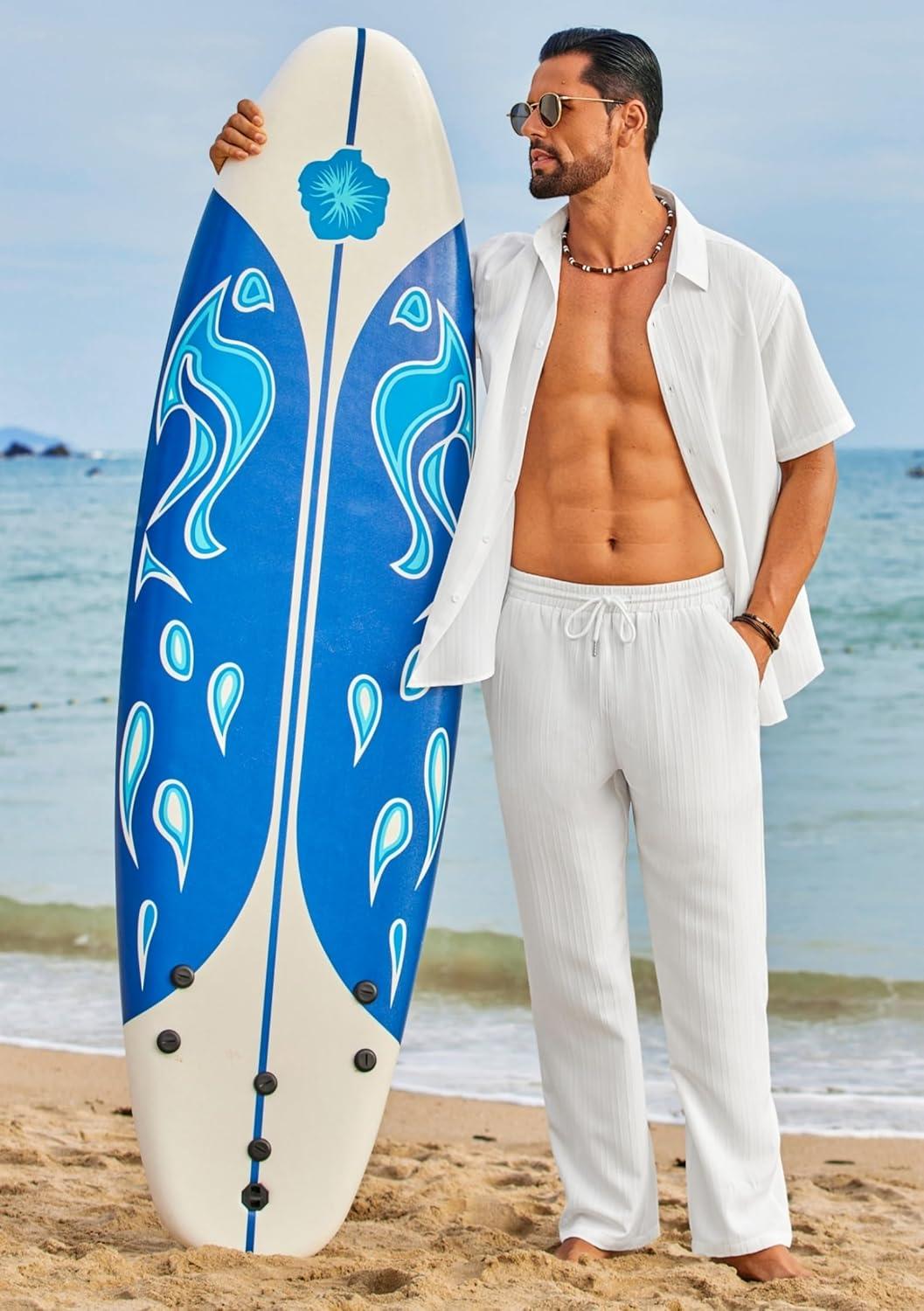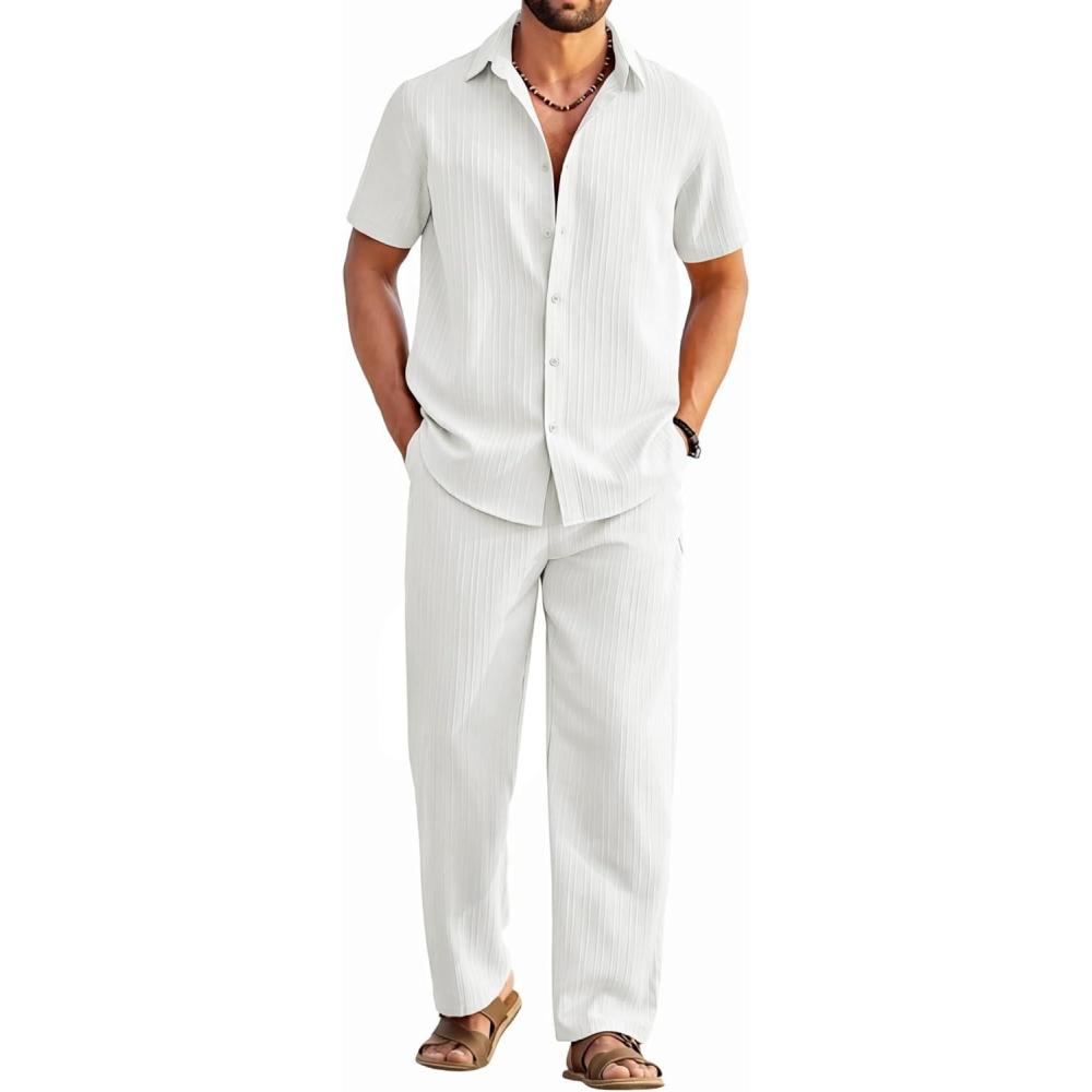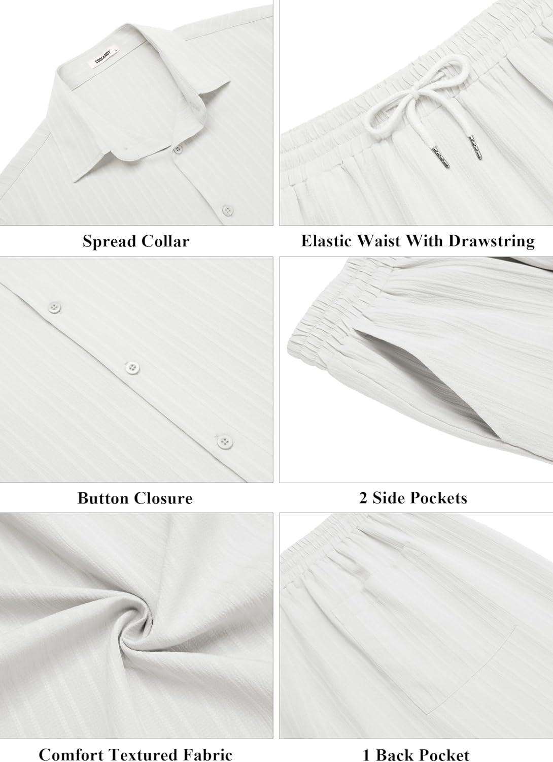 COOFANDY Mens 2 Piece Outfits Casual Summer Beach Textured Button Down Shirt Loose Pants Set(White)