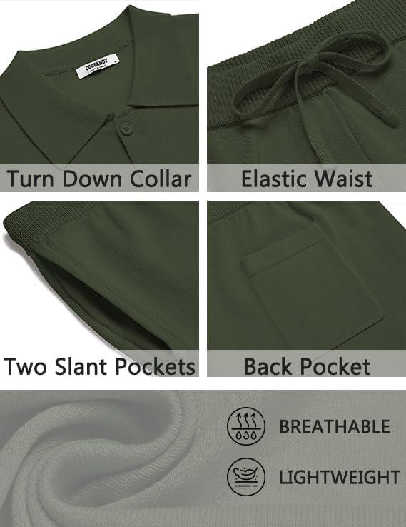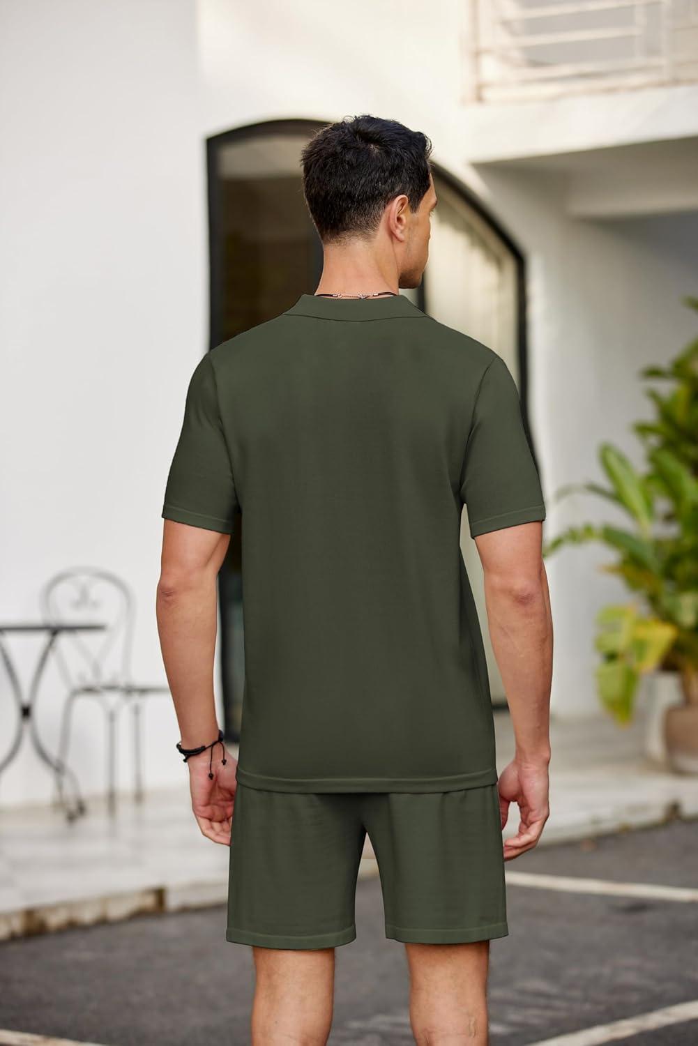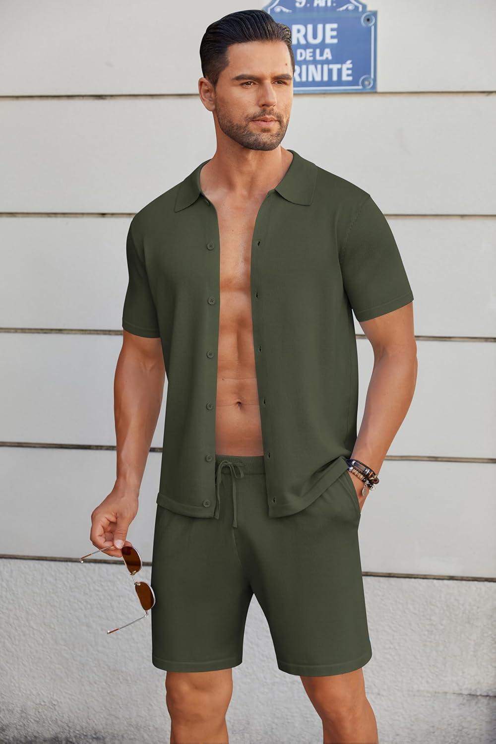 COOFANDY Men’s 2 Piece Outfits Sets Casual Short Sleeve Button Down Knit Shirt and Shorts Sets Summer Beach Outfits(Army Green)