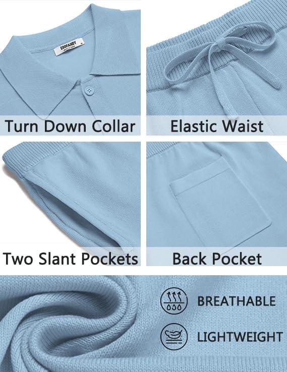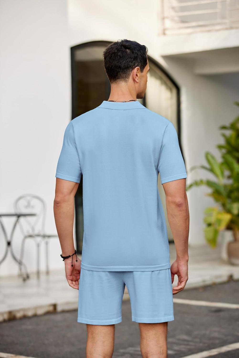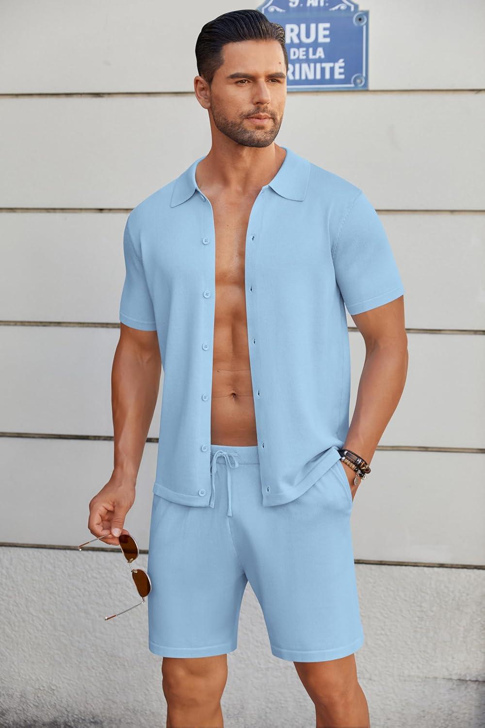 COOFANDY Men's 2 Piece Outfits Sets Casual Short Sleeve Button Down Knit Shirt and Shorts Sets Summer Beach Outfits(Blue)
