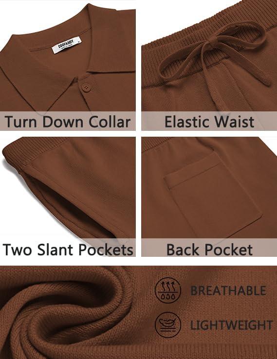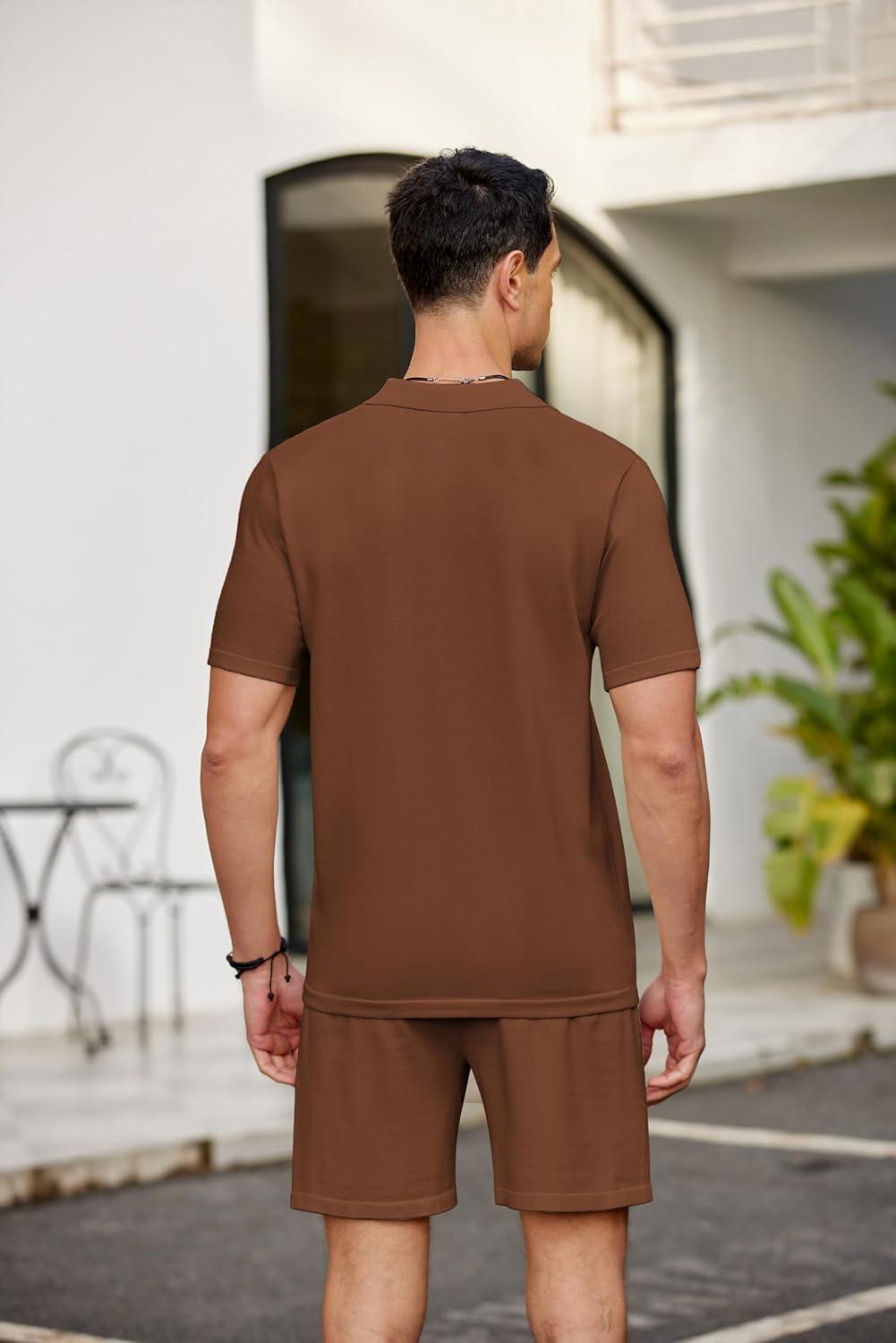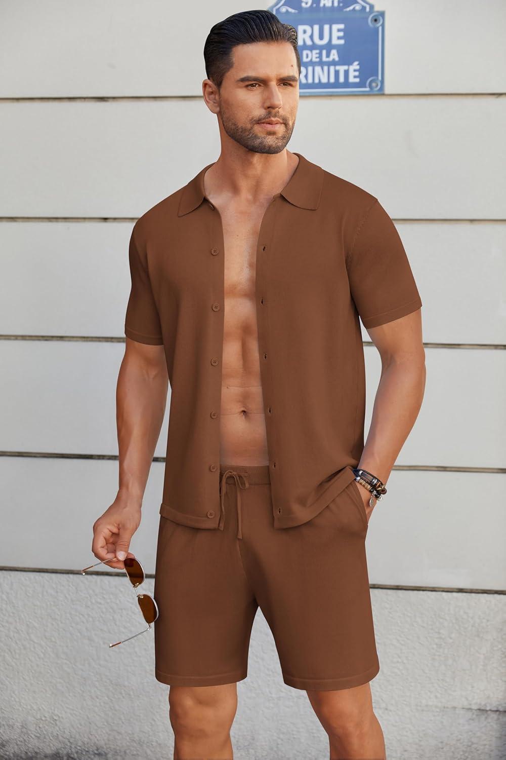 COOFANDY Men's 2 Piece Outfits Sets Casual Short Sleeve Button Down Knit Shirt and Shorts Sets Summer Beach Outfits(Brown)