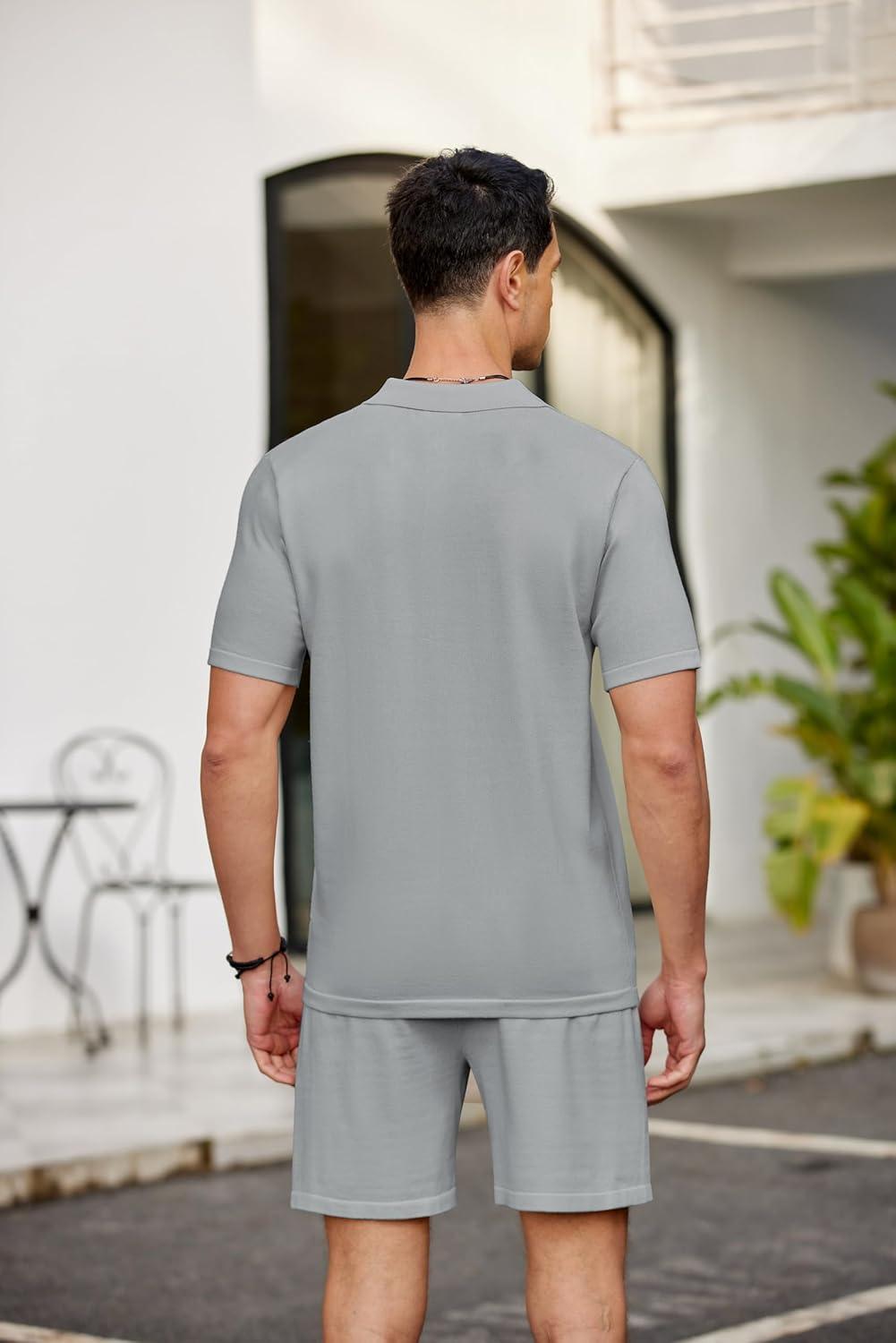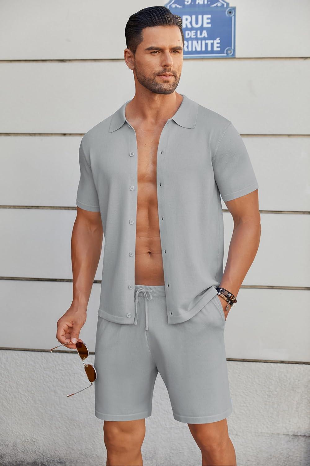 COOFANDY Men's 2 Piece Outfits Sets Casual Short Sleeve Button Down Knit Shirt and Shorts Sets Summer Beach Outfits(Light Grey)