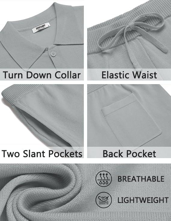 COOFANDY Men’s 2 Piece Outfits Sets Casual Short Sleeve Button Down Knit Shirt and Shorts Sets Summer Beach Outfits(Light Grey)