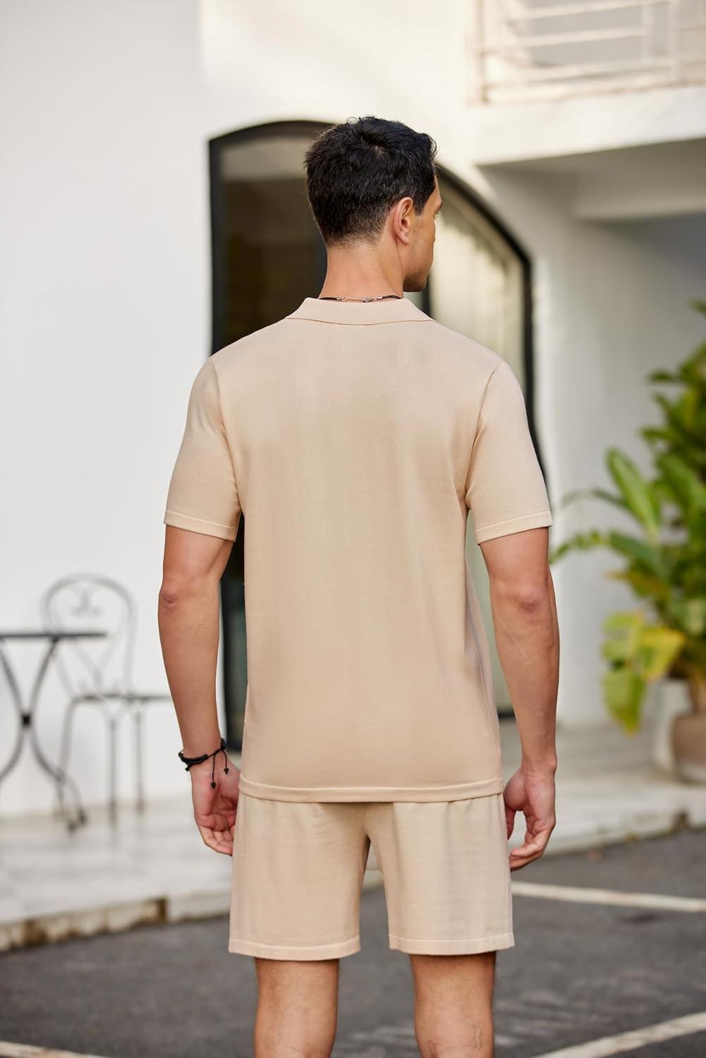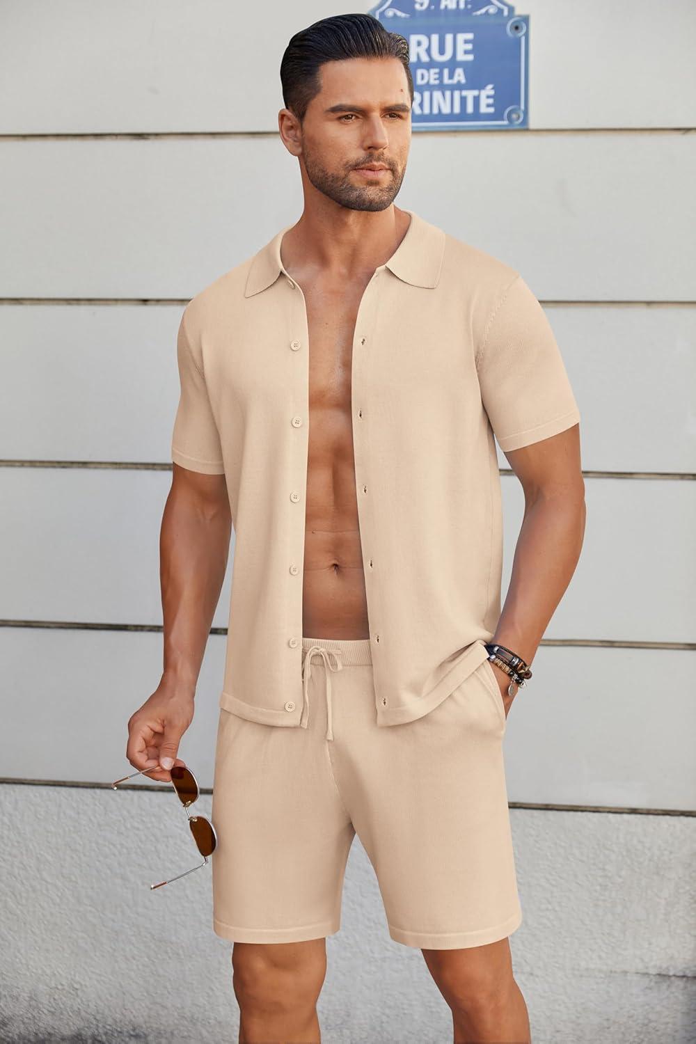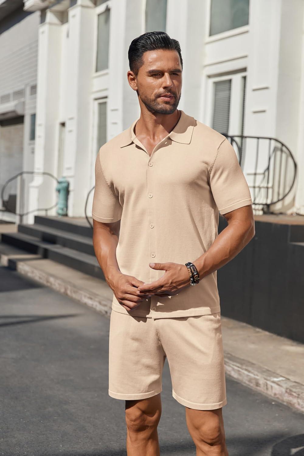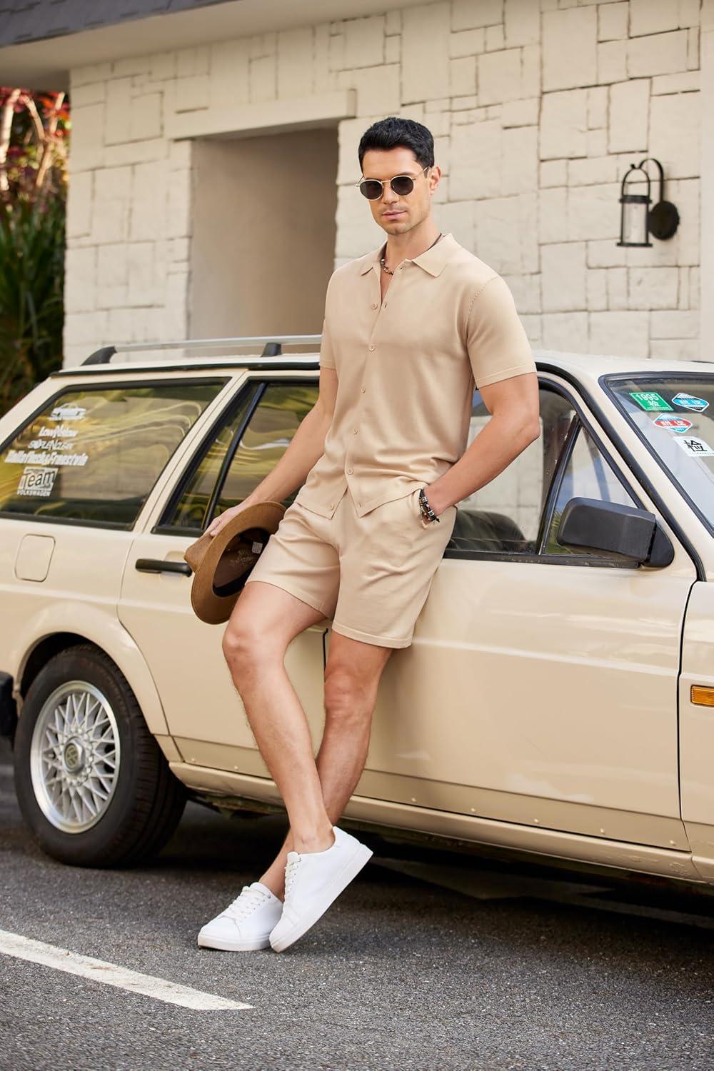COOFANDY Men's 2 Piece Outfits Sets Casual Short Sleeve Button Down Knit Shirt and Shorts Sets Summer Beach Outfits(Light Khaki)