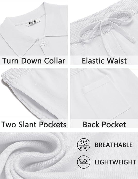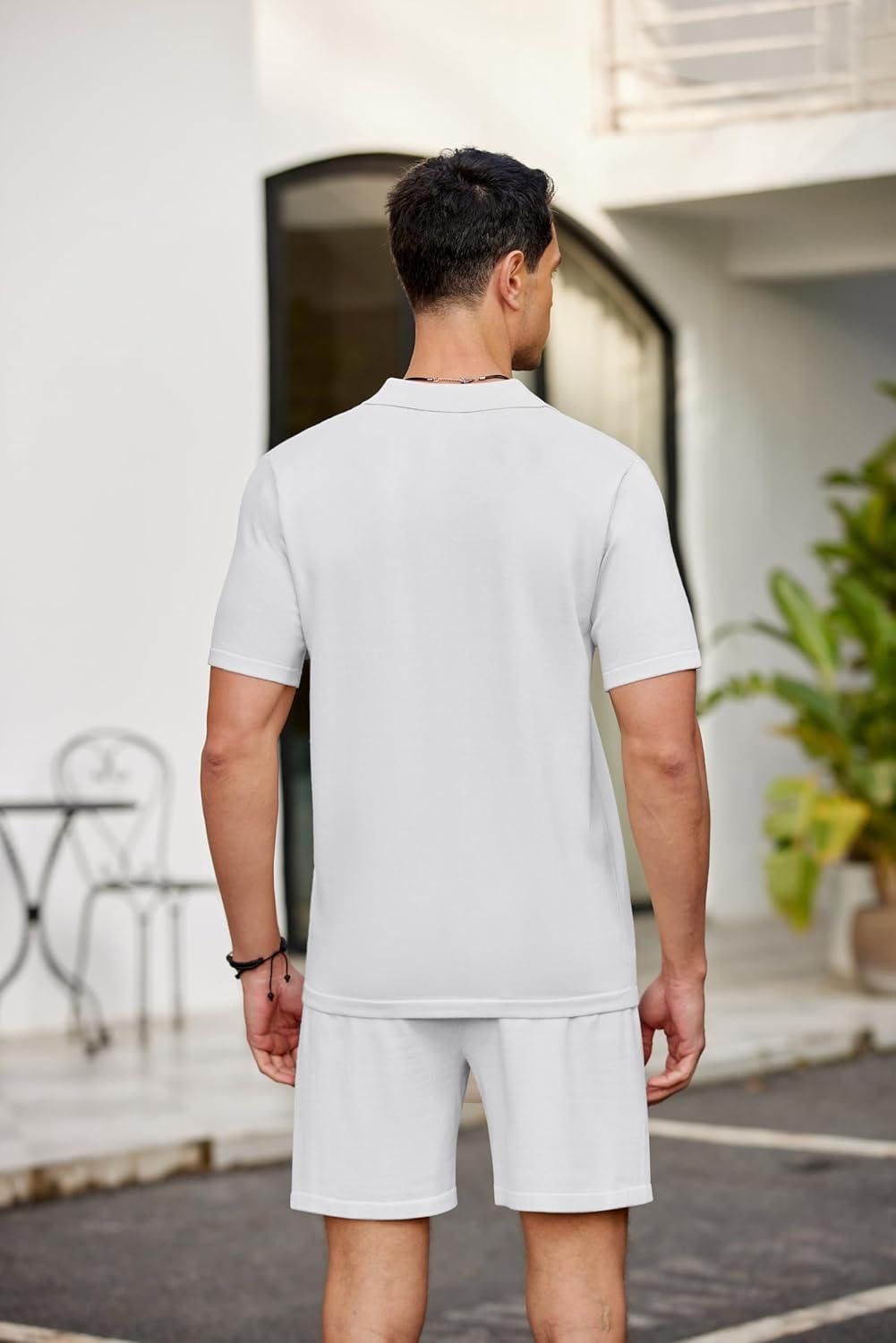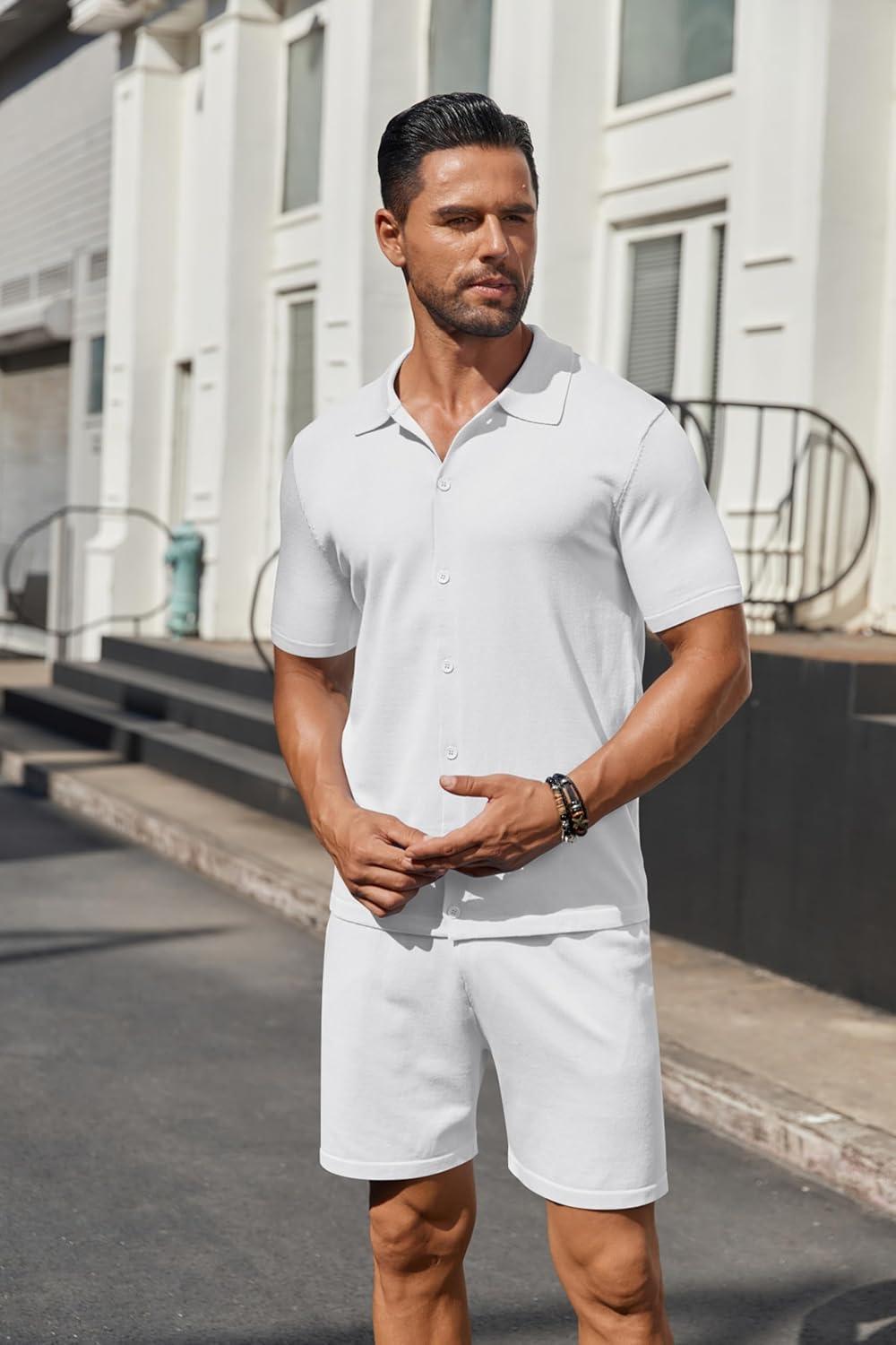 COOFANDY Men's 2 Piece Outfits Sets Casual Short Sleeve Button Down Knit Shirt and Shorts Sets Summer Beach Outfits(White)