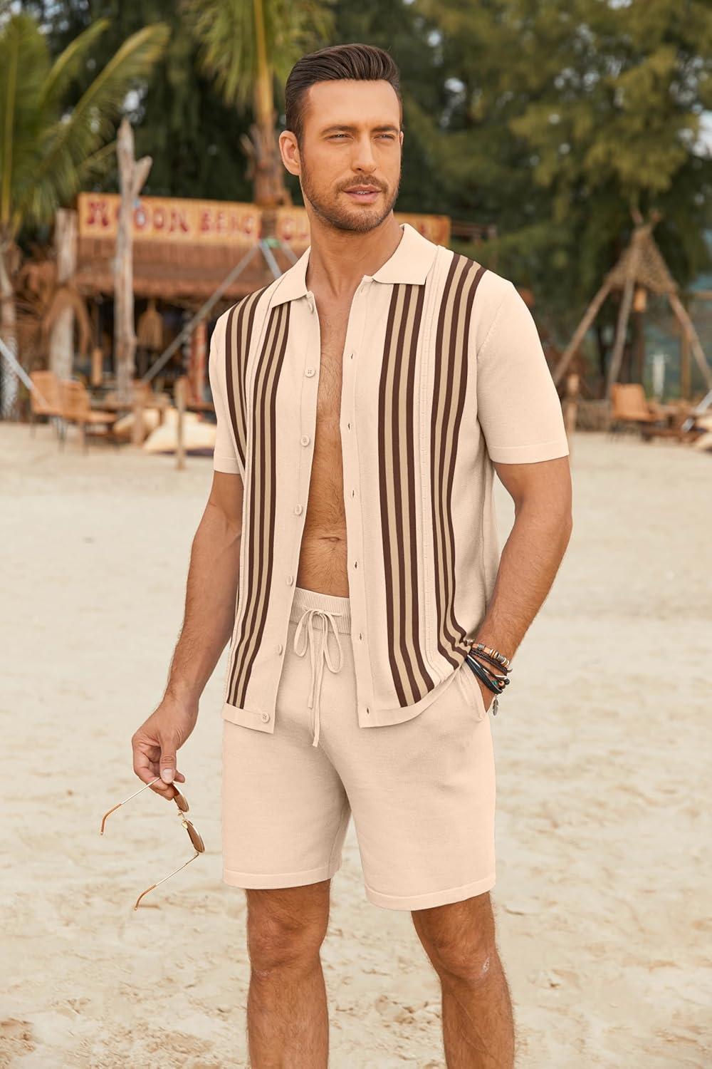 COOFANDY Men's 2 Piece Outfits Summer Short Sets Vintage Knit Button Down Shirt Short Sleeve Polo Casual Beach Suits(Light Khaki)