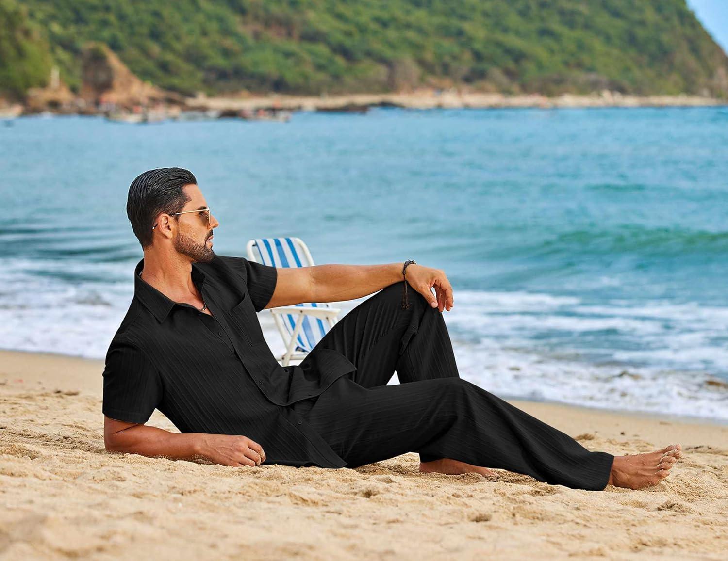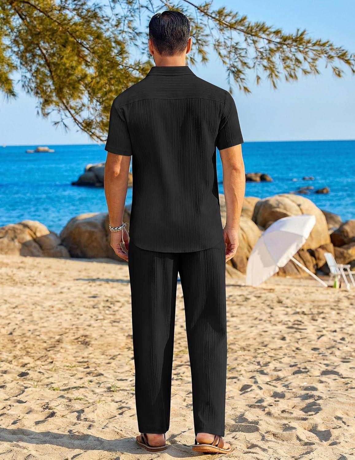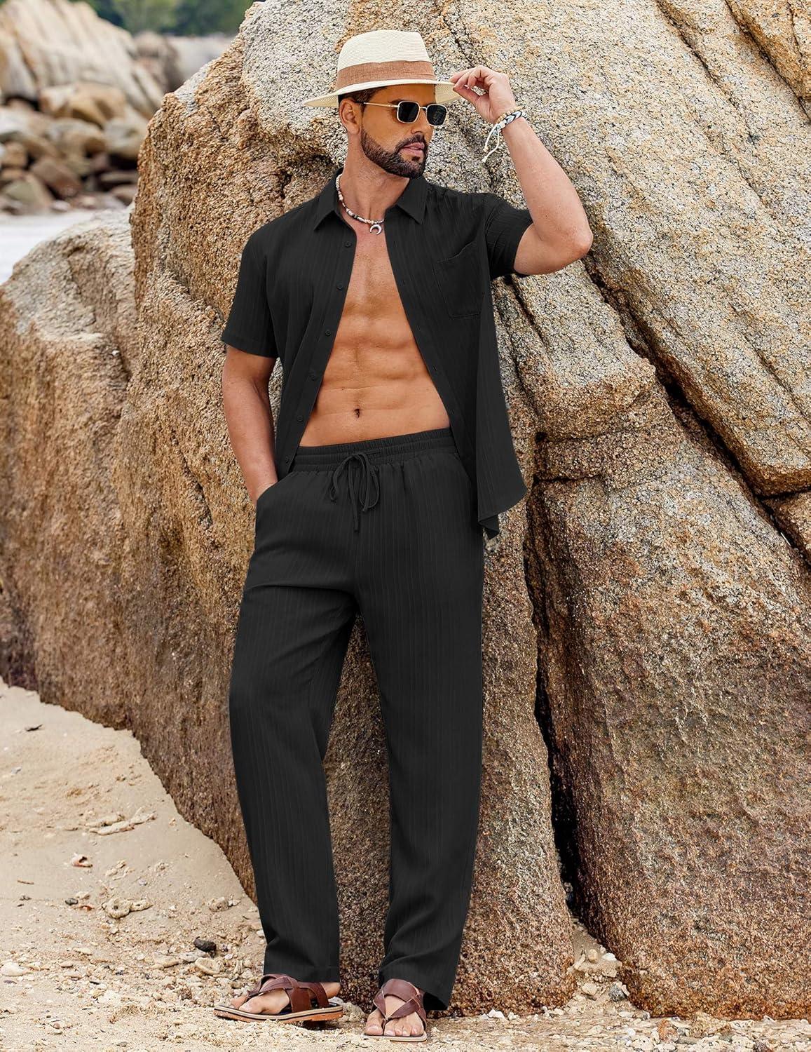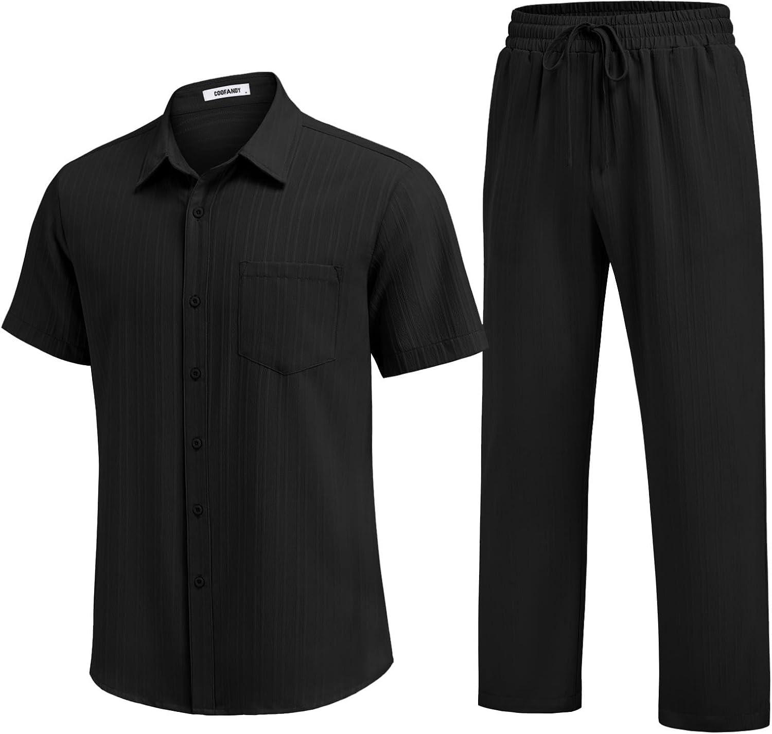 COOFANDY Mens 2 Piece Sets Summer Outfits Short Sleeve Button Down Shirt Loose Pant Sets Beach Vacation Outfits(Black)