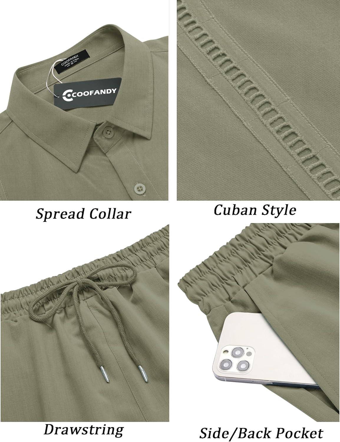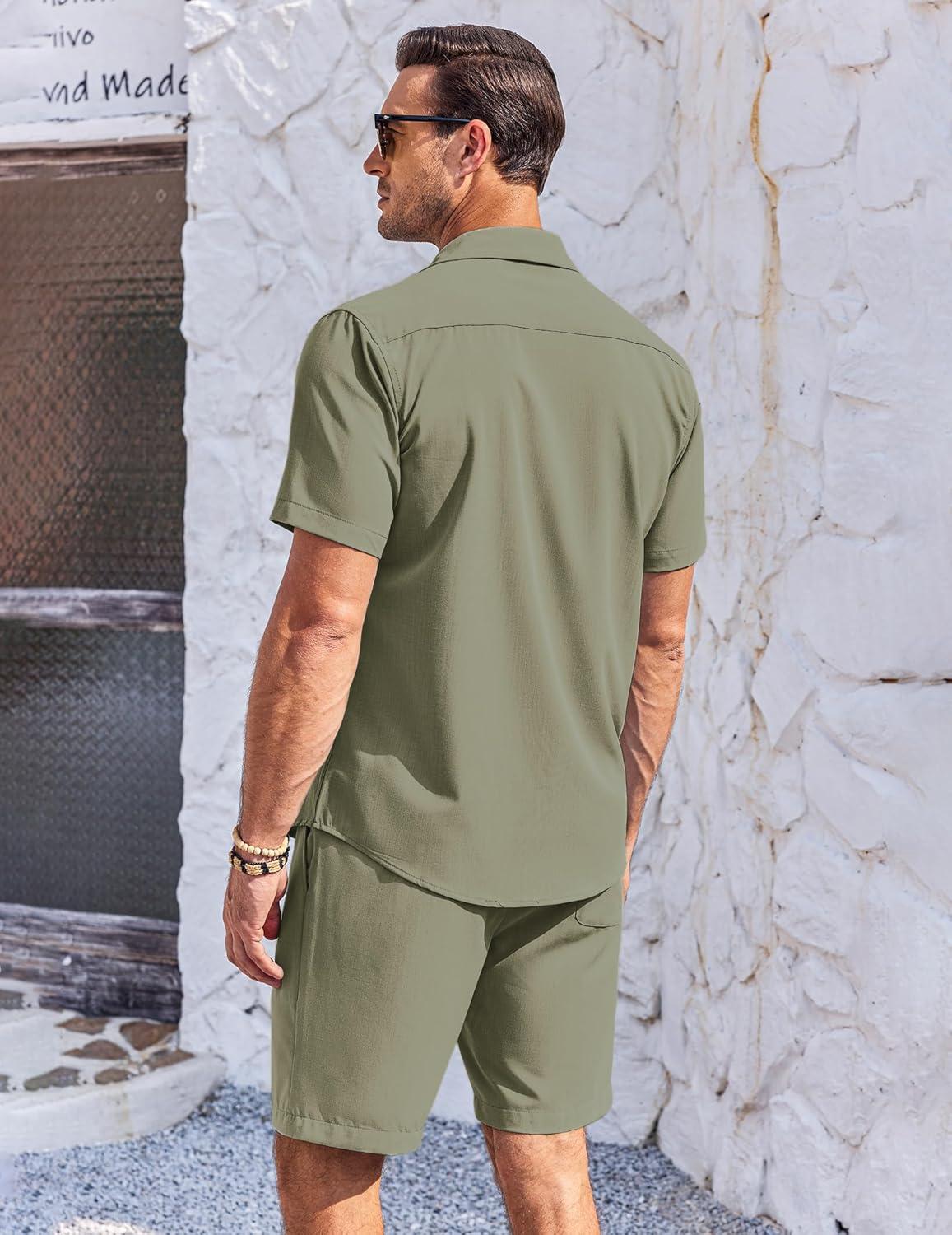 COOFANDY Men’s 2 Piece Short Set Cuban Guayabera Shirts Short Sleeve Casual Beach Outfits Set(Army Green)