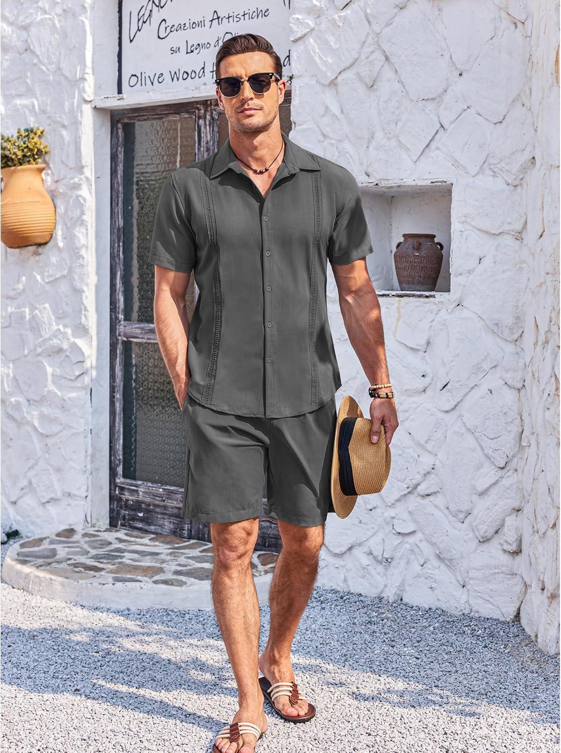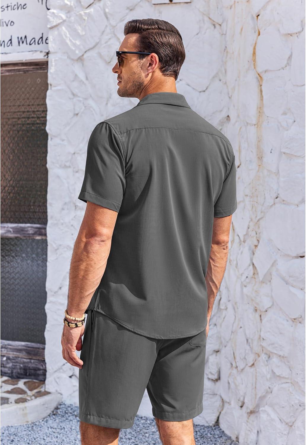 COOFANDY Men’s 2 Piece Short Set Cuban Guayabera Shirts Short Sleeve Casual Beach Outfits Set(Dark Gray)