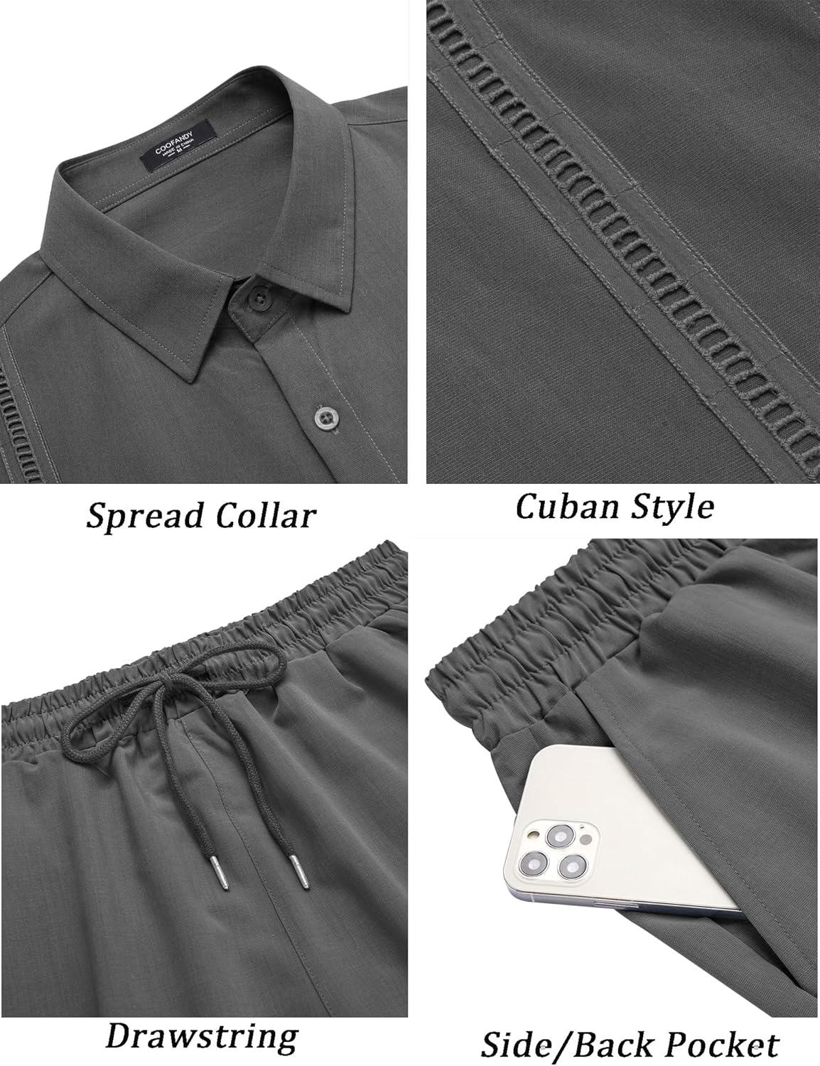 COOFANDY Men's 2 Piece Short Set Cuban Guayabera Shirts Short Sleeve Casual Beach Outfits Set(Dark Gray)