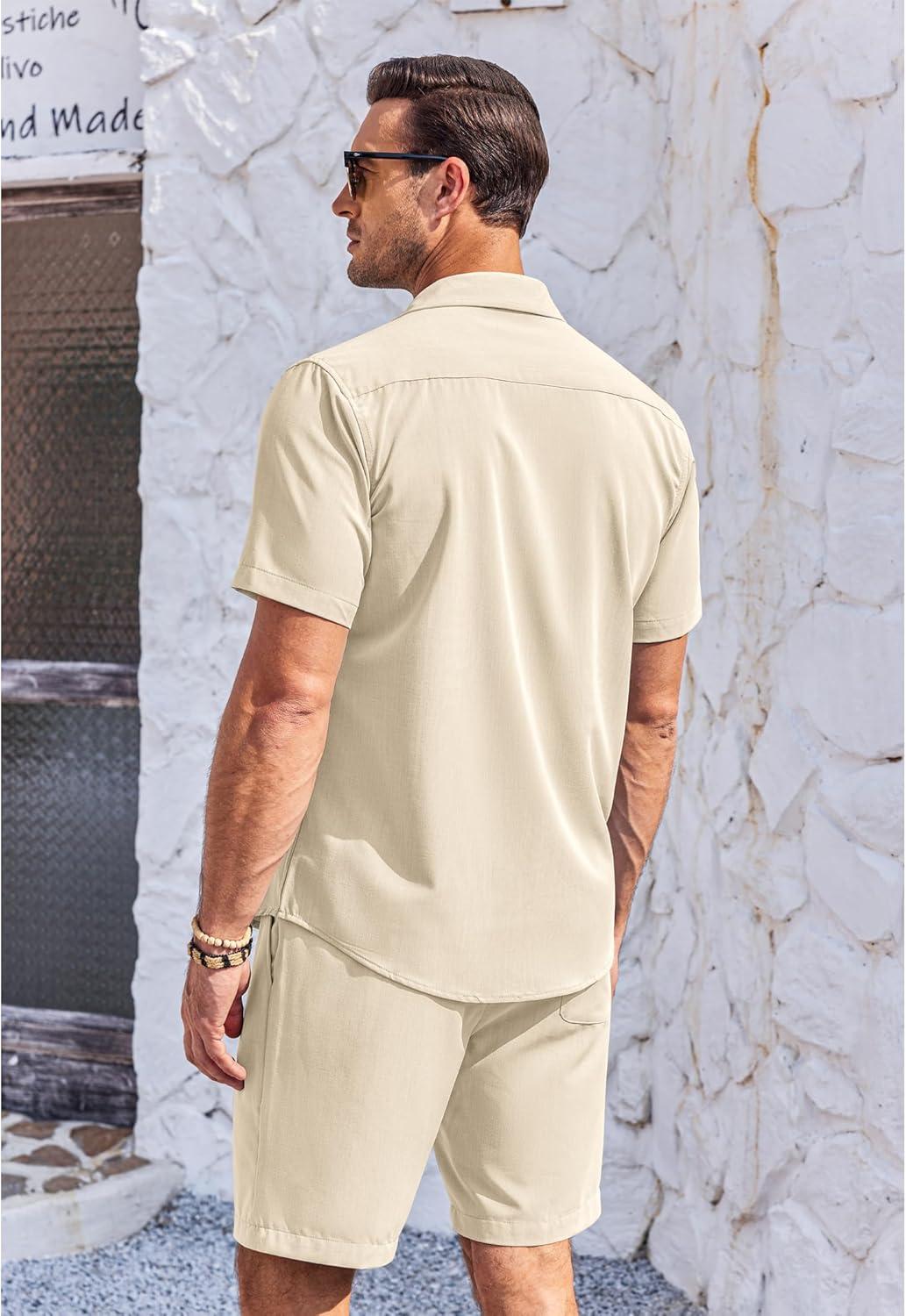COOFANDY Men’s 2 Piece Short Set Cuban Guayabera Shirts Short Sleeve Casual Beach Outfits Set(Khaki)