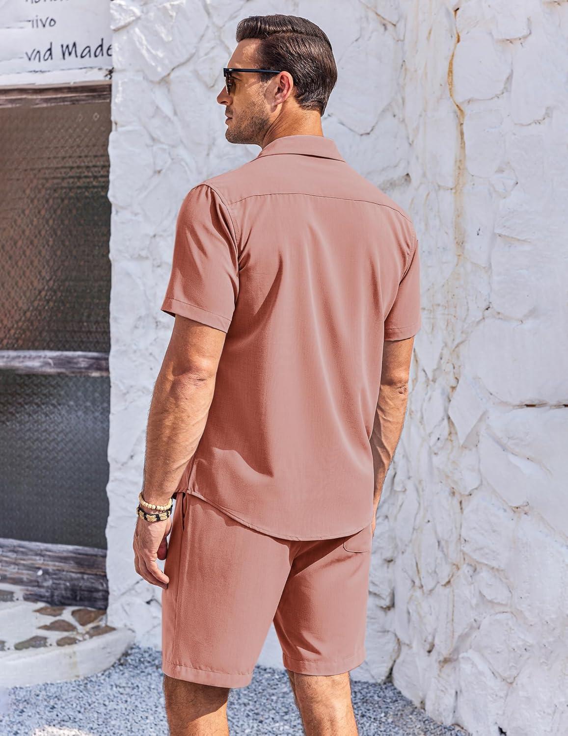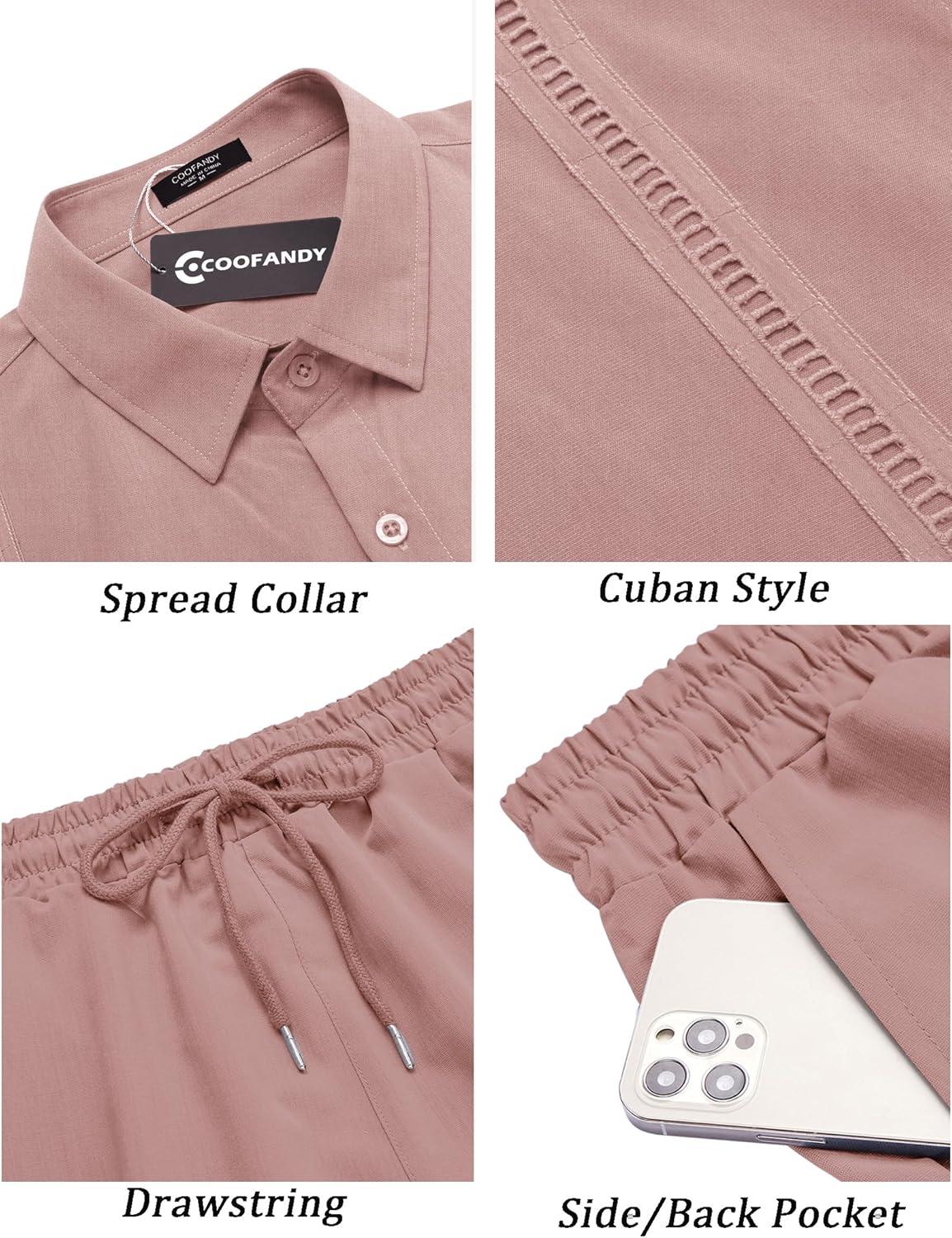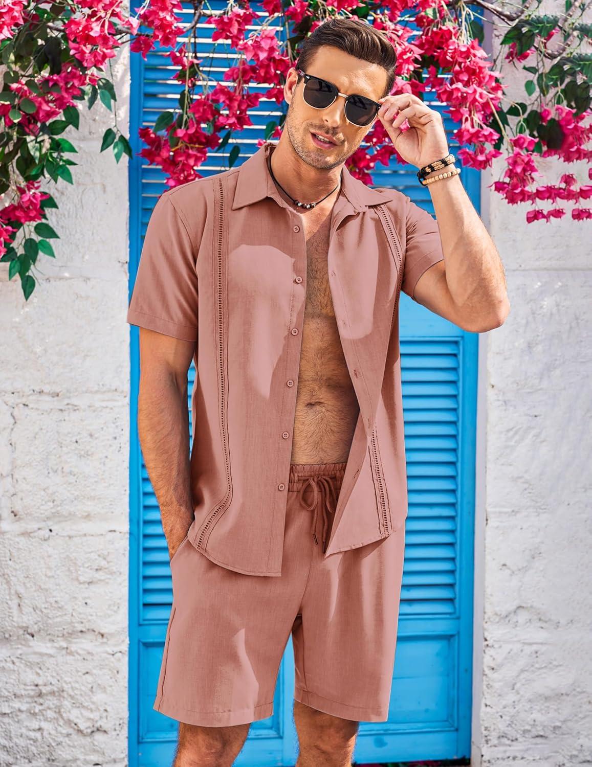 COOFANDY Men's 2 Piece Short Set Cuban Guayabera Shirts Short Sleeve Casual Beach Outfits Set(Pink)