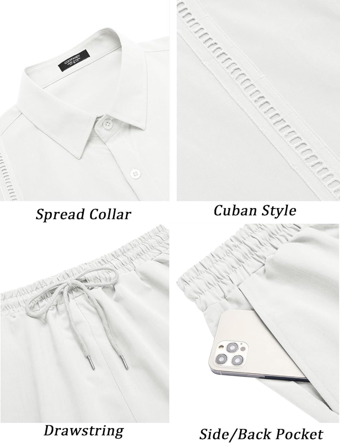 COOFANDY Men's 2 Piece Short Set Cuban Guayabera Shirts Short Sleeve Casual Beach Outfits Set(White)