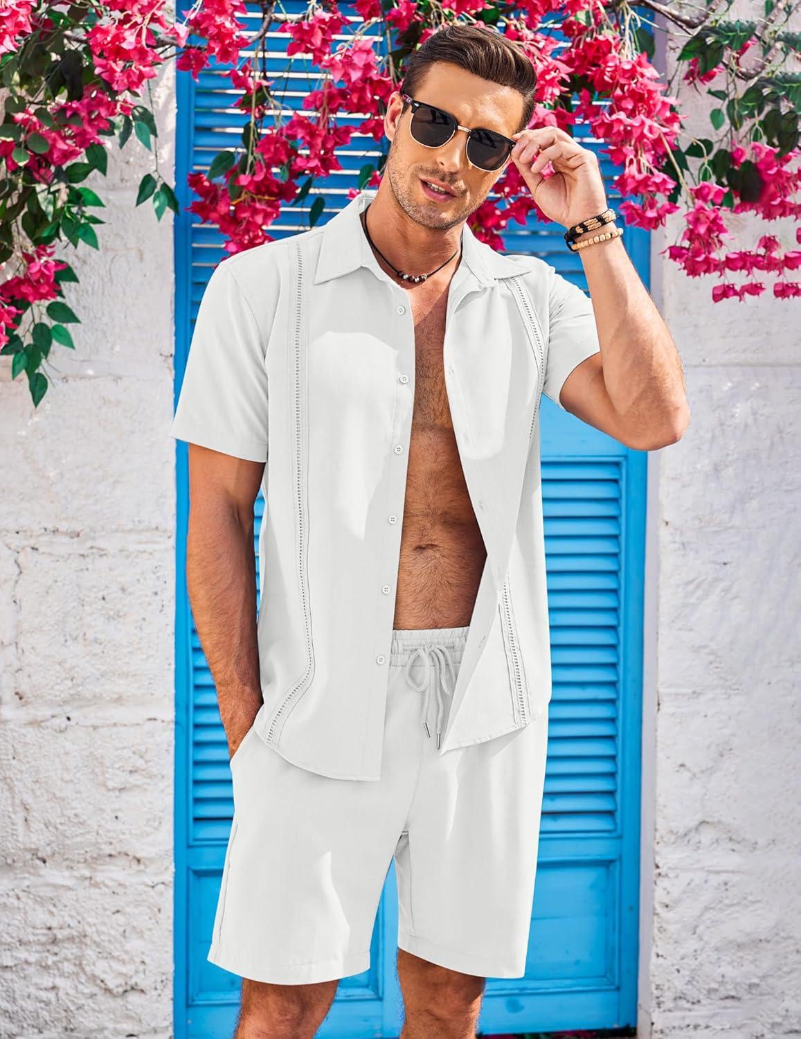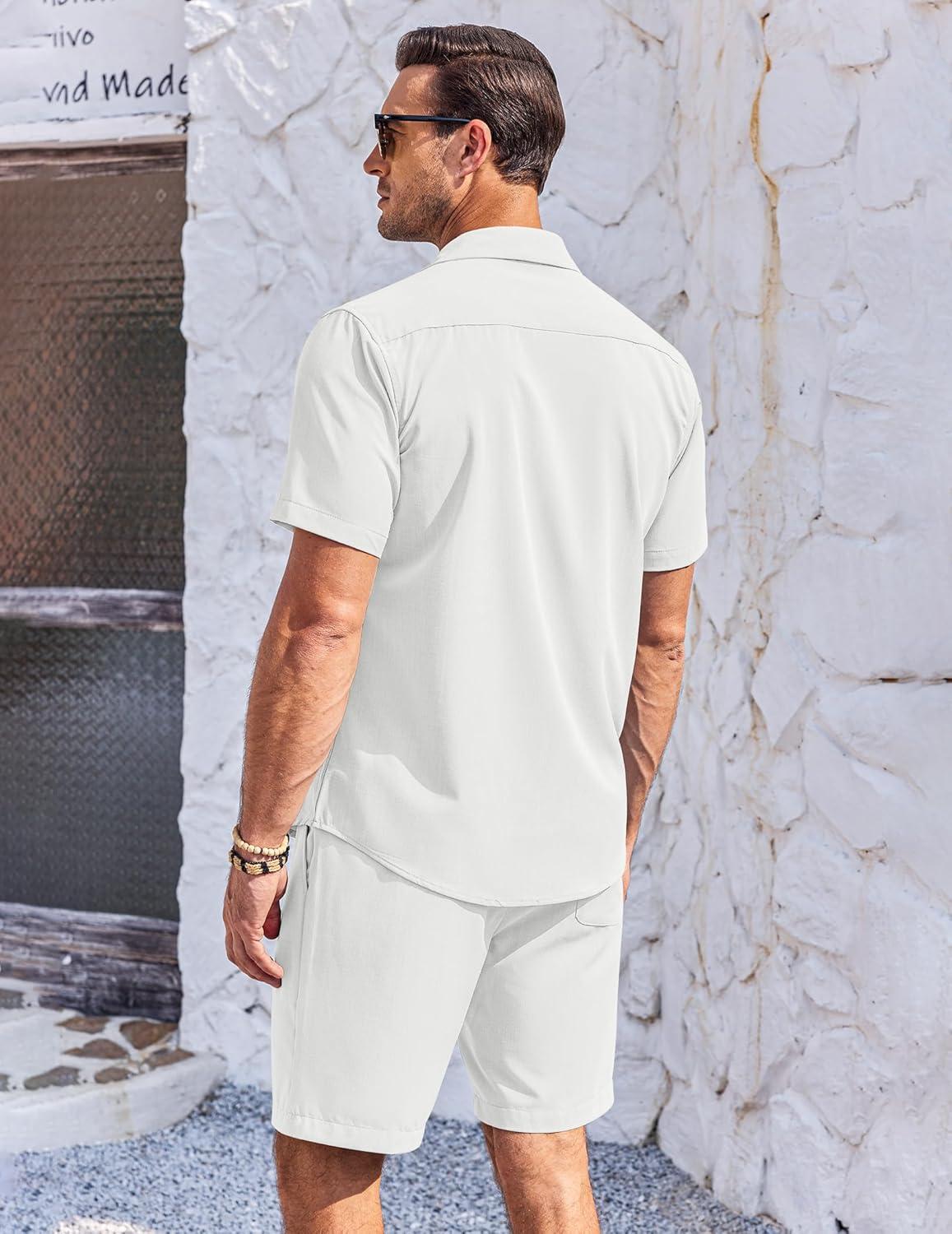 COOFANDY Men’s 2 Piece Short Set Cuban Guayabera Shirts Short Sleeve Casual Beach Outfits Set(White)