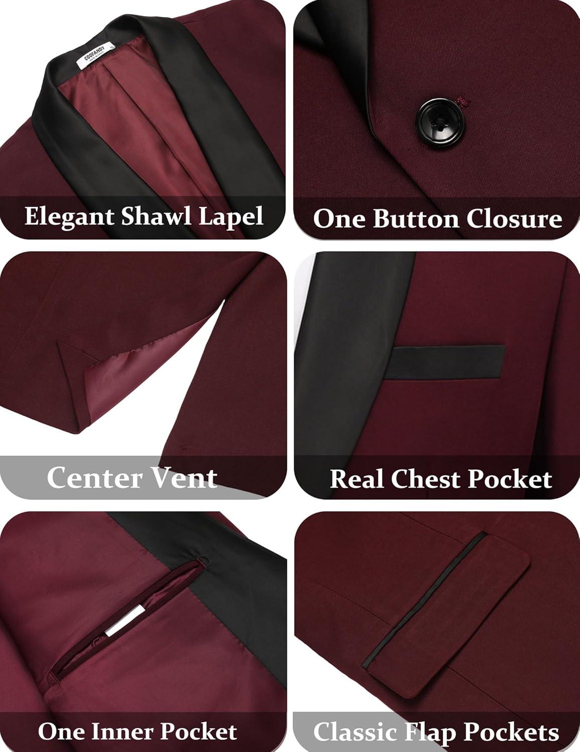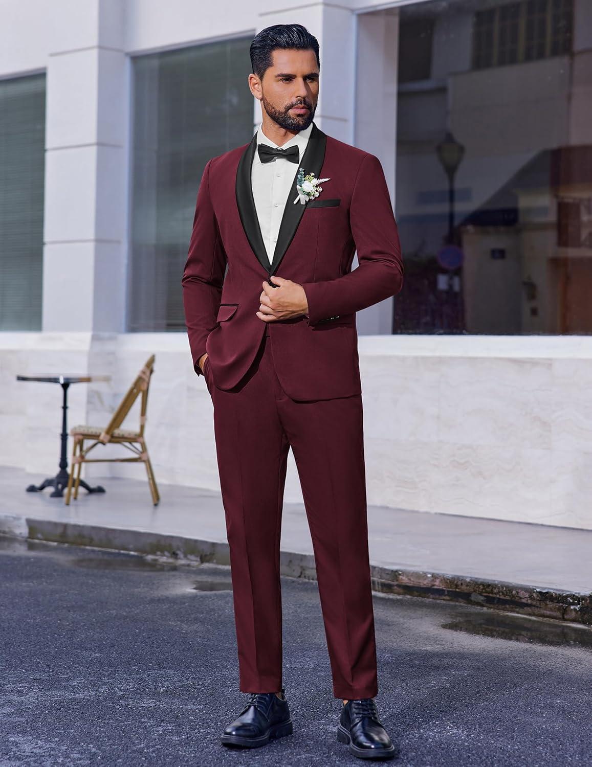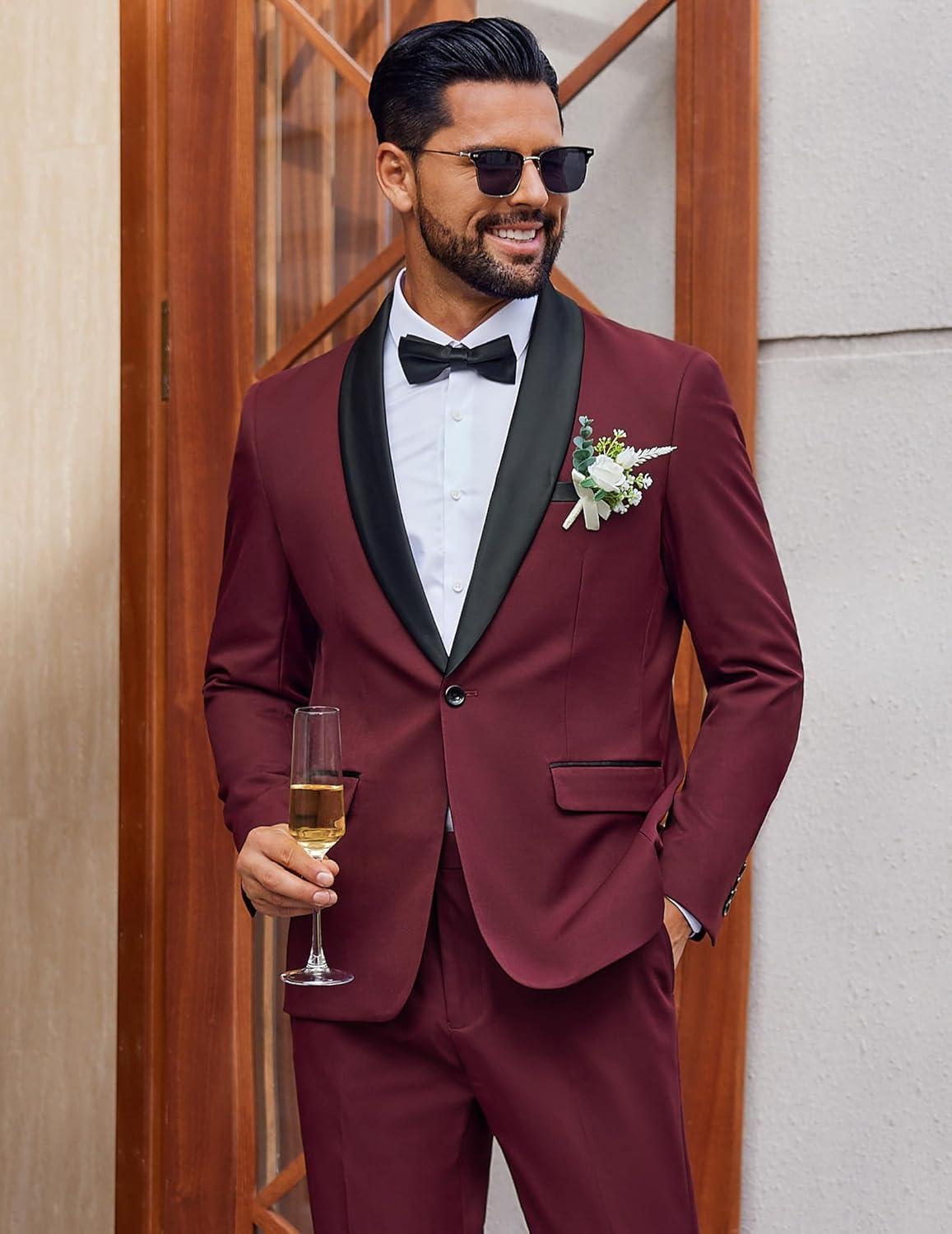 COOFANDY Men's 2 Piece Suit Slim Fit Shawl Lapel One Button Formal Tuxedo Jacket Pants Set for Wedding Prom Business(Wine Red)