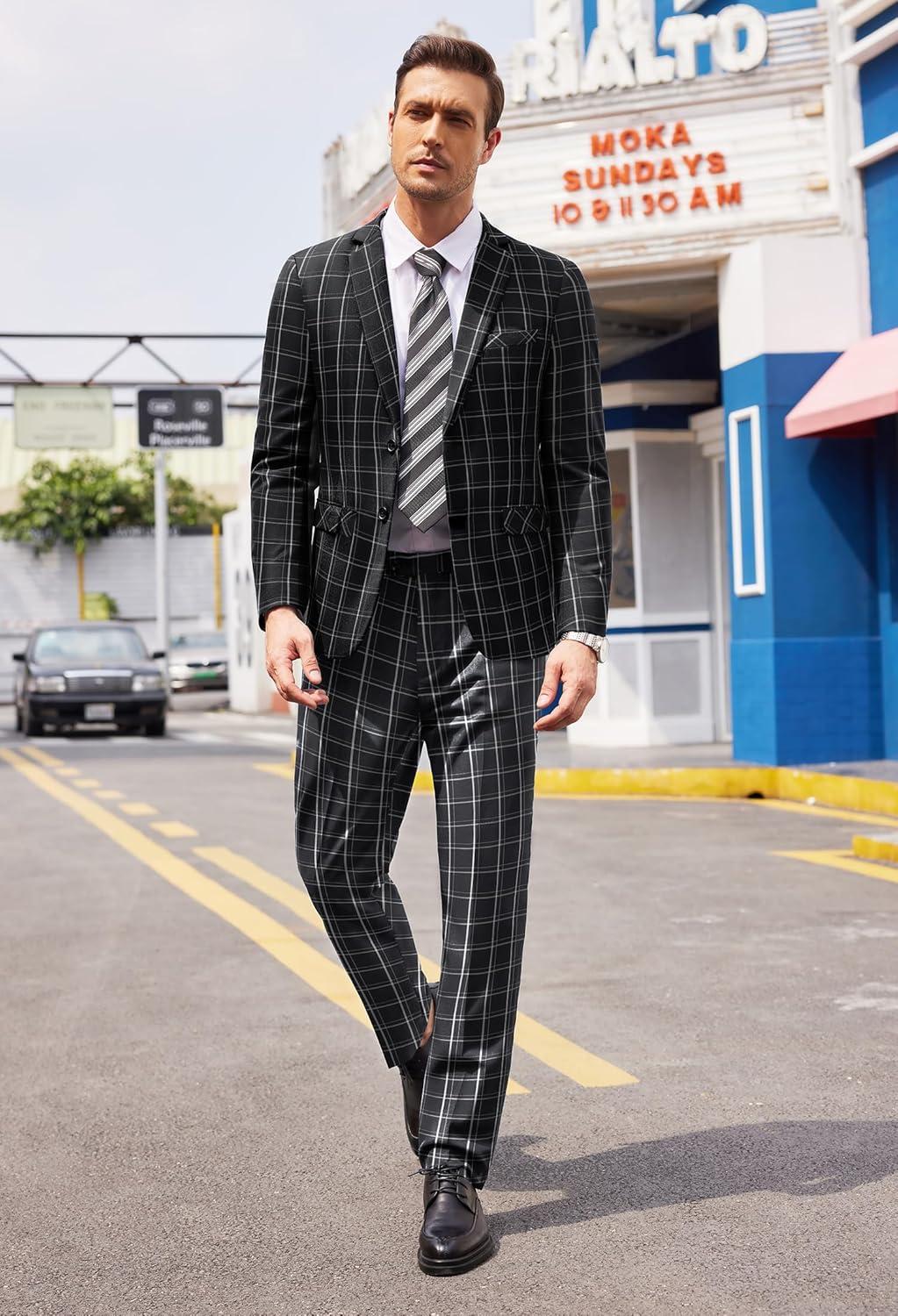 COOFANDY Men's 2 Piece Suits Classic Fit 2 Button Dress Suits Tuxedo Jacket Blazer for Wedding Business Dinner Prom(Black ( Plaid ))