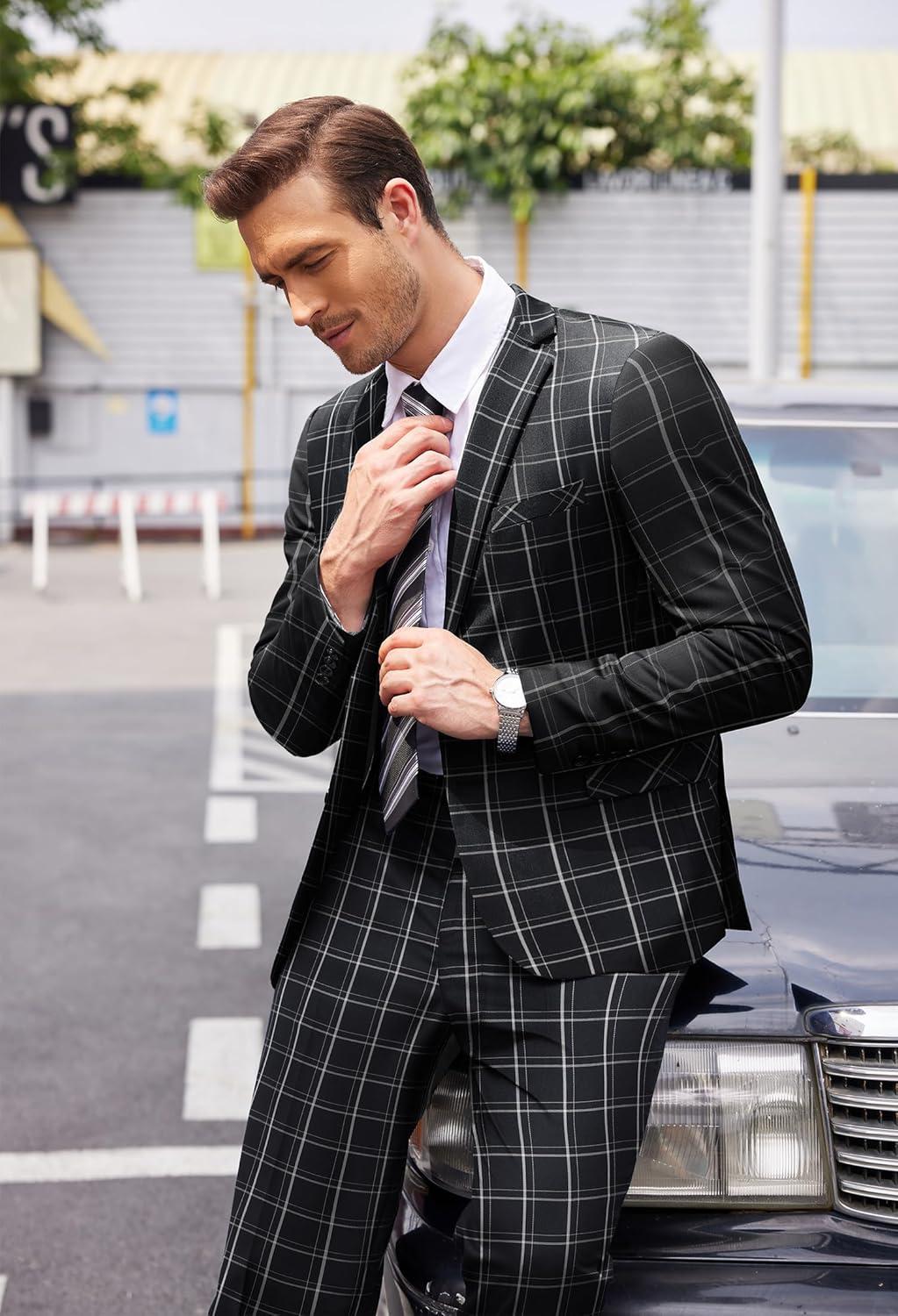 imageCOOFANDY Mens 2 Piece Suits Classic Fit 2 Button Dress Suits Tuxedo Jacket Blazer for Wedding Business Dinner PromBlack  Plaid