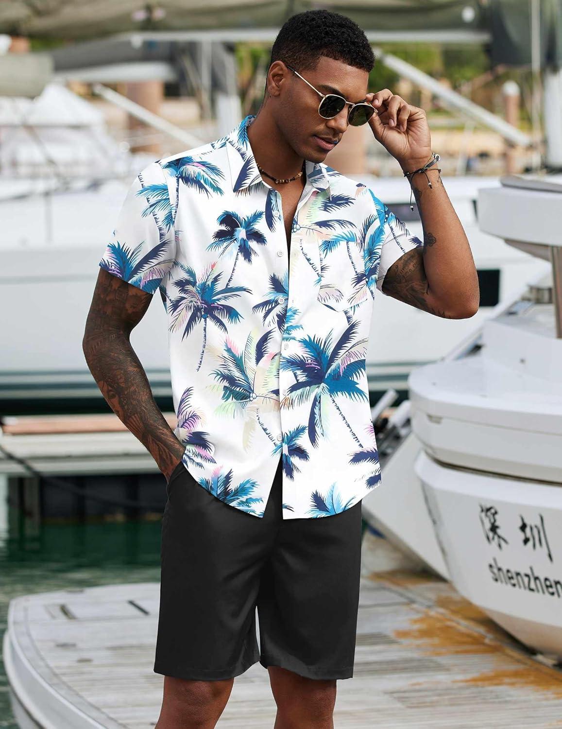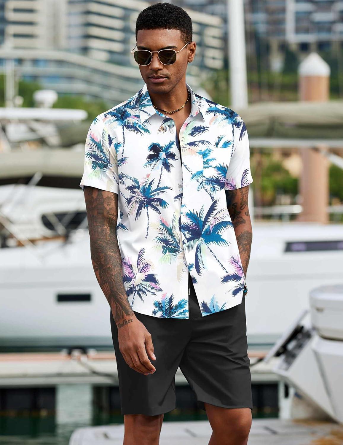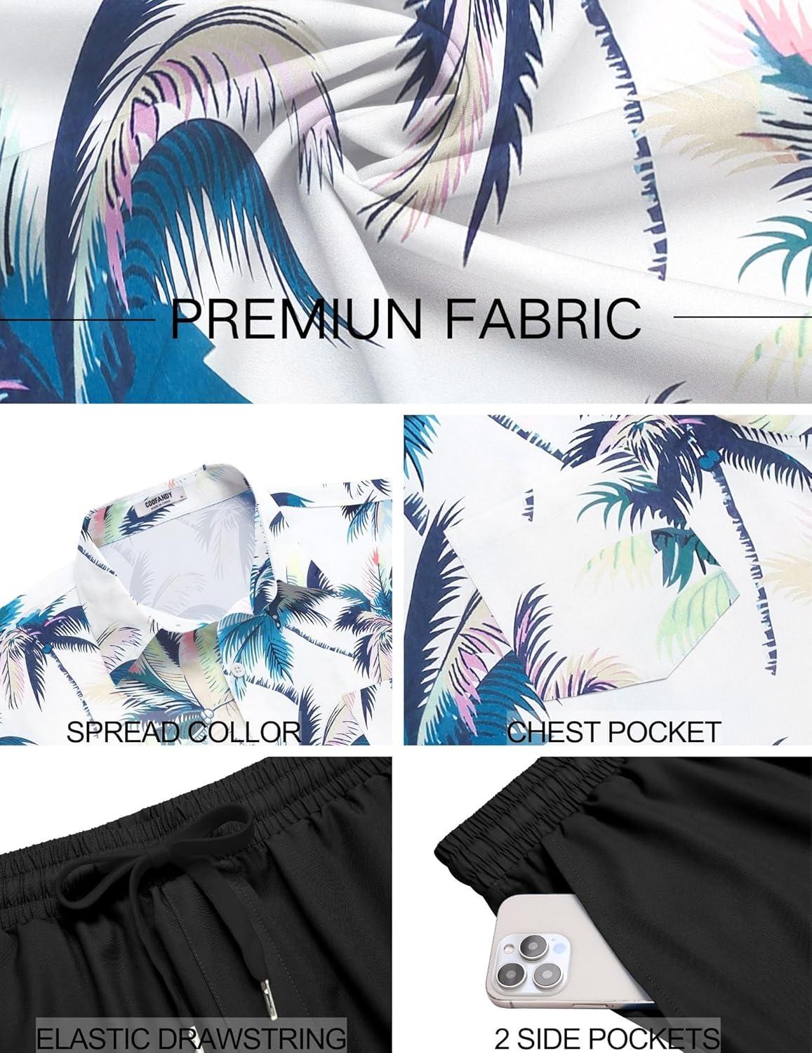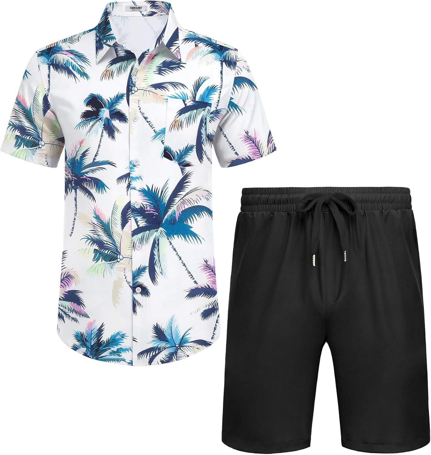 COOFANDY Men’s 2 Piece Summer Beach Outfits Tropical Short Sleeve Button Down Shirts and Shorts Hawaiian Vacation Sets(Blue White Tropical)