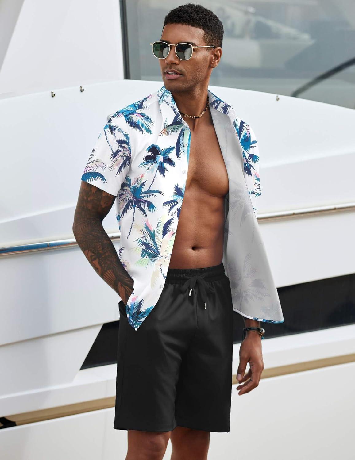 COOFANDY Men’s 2 Piece Summer Beach Outfits Tropical Short Sleeve Button Down Shirts and Shorts Hawaiian Vacation Sets(Stripe)