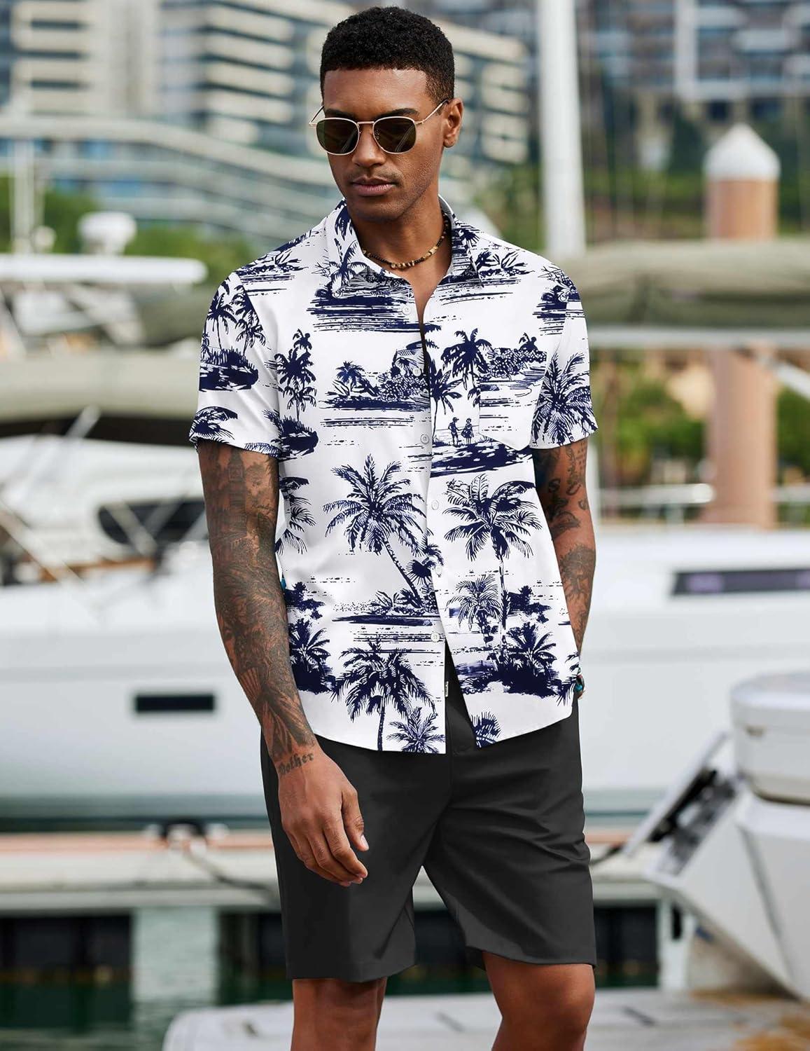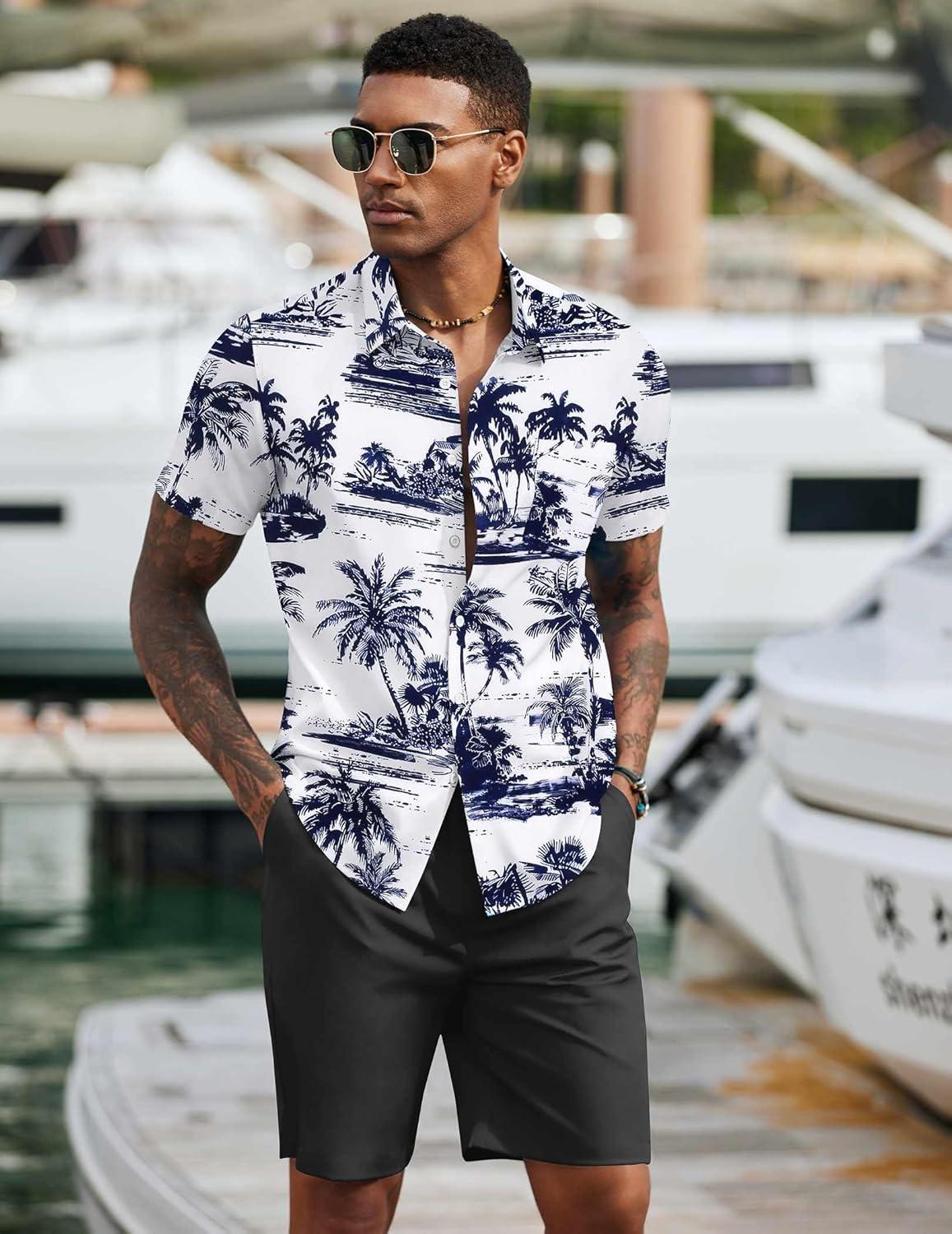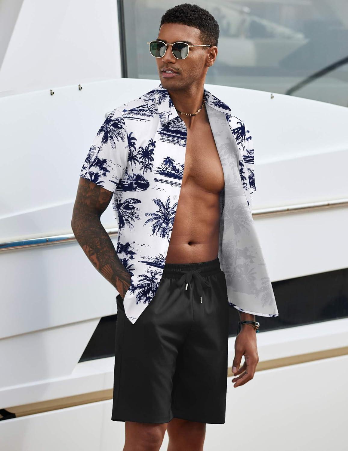 COOFANDY Men's 2 Piece Summer Beach Outfits Tropical Short Sleeve Button Down Shirts and Shorts Hawaiian Vacation Sets(Navy Palm Leaf)