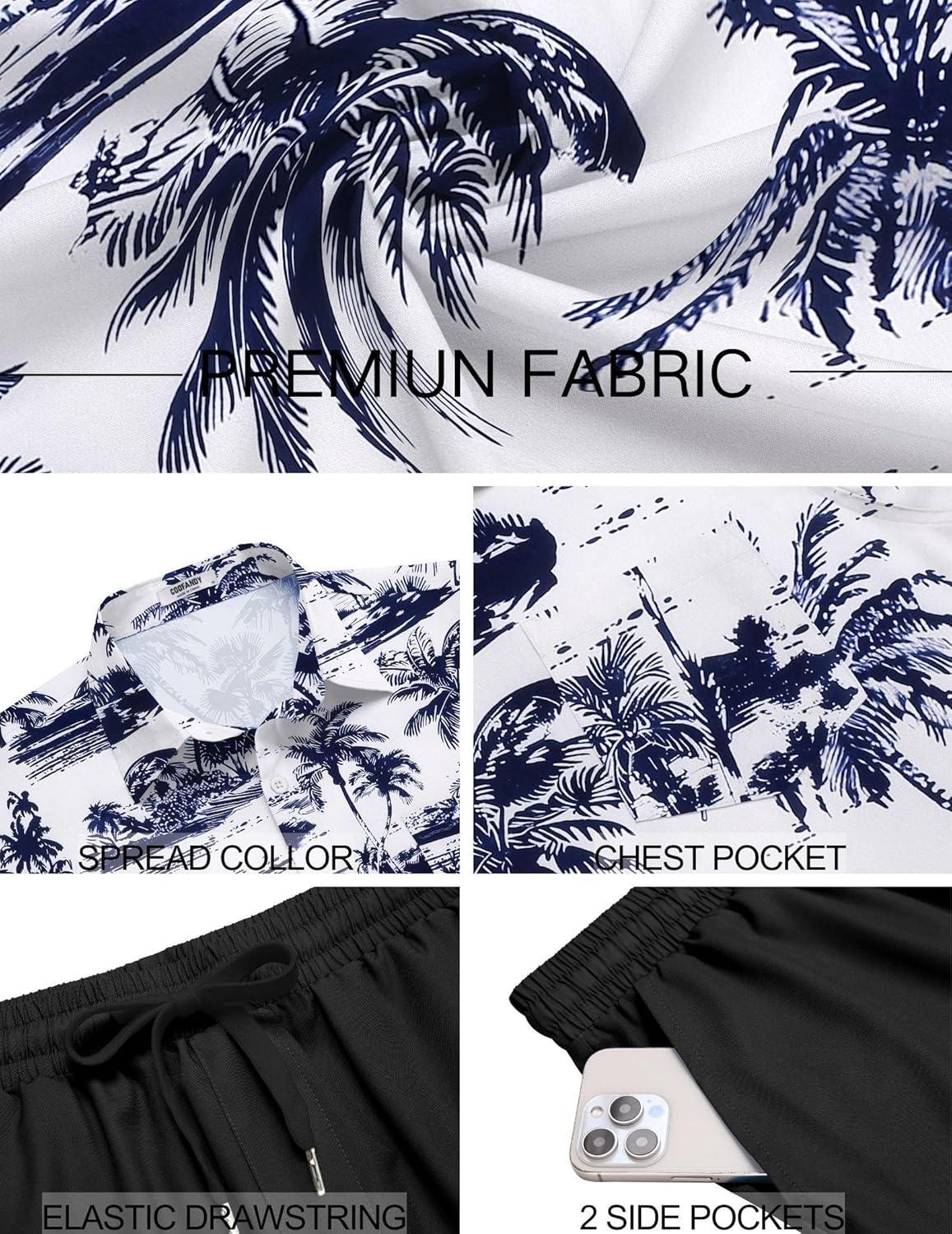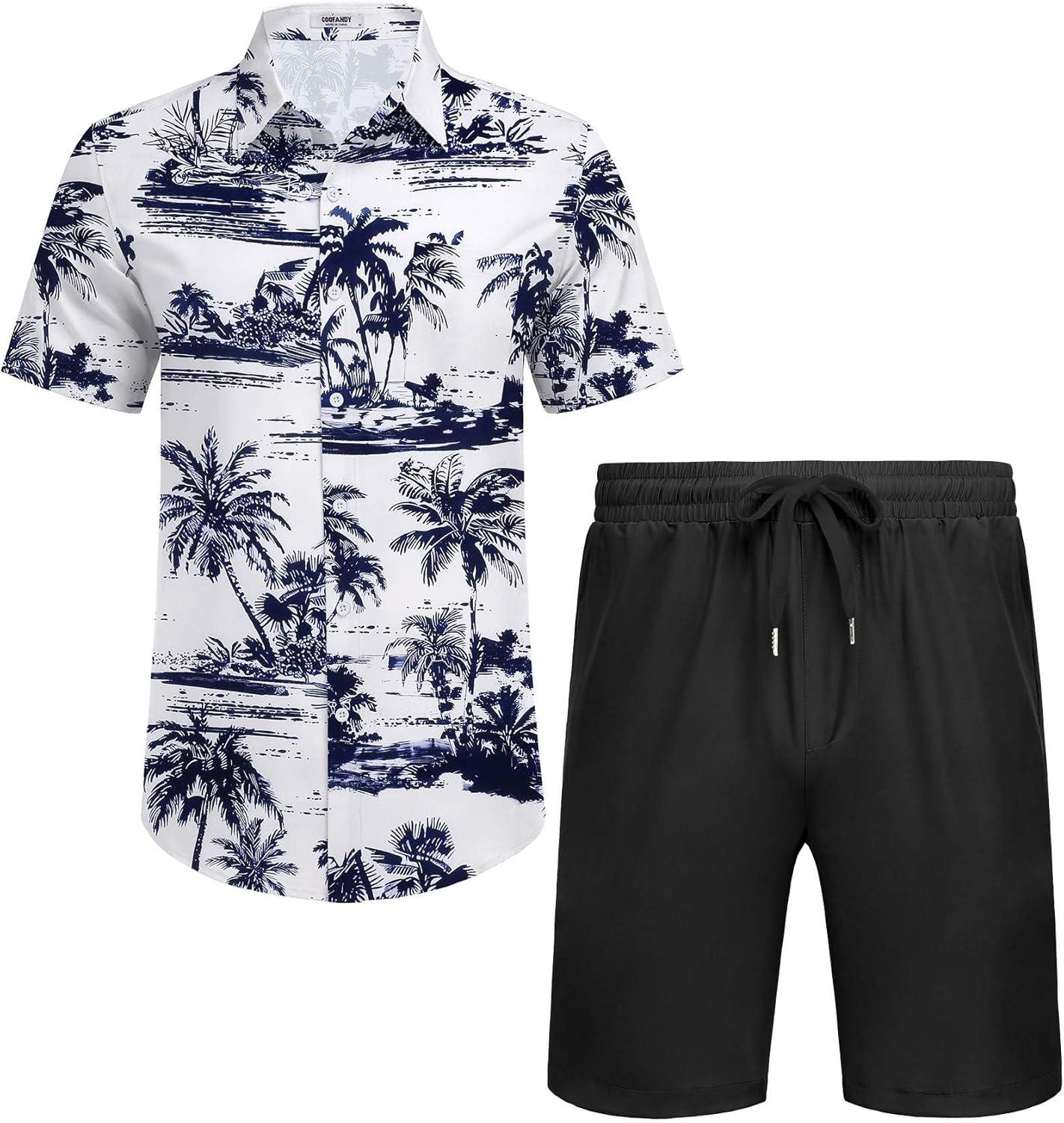 COOFANDY Men’s 2 Piece Summer Beach Outfits Tropical Short Sleeve Button Down Shirts and Shorts Hawaiian Vacation Sets(Navy Green Leaf)