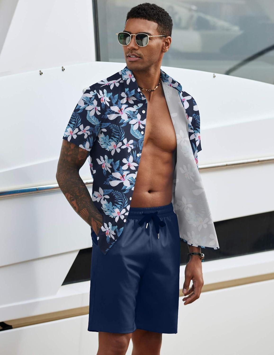 COOFANDY Men’s 2 Piece Summer Beach Outfits Tropical Short Sleeve Button Down Shirts and Shorts Hawaiian Vacation Sets(Navy White Flower)
