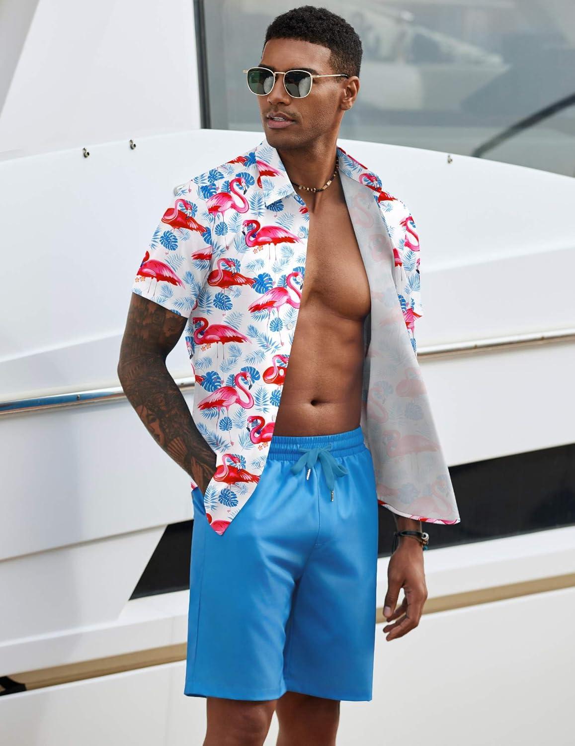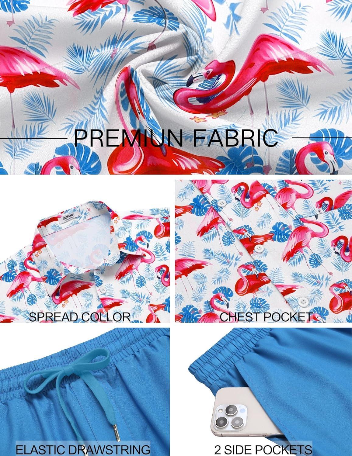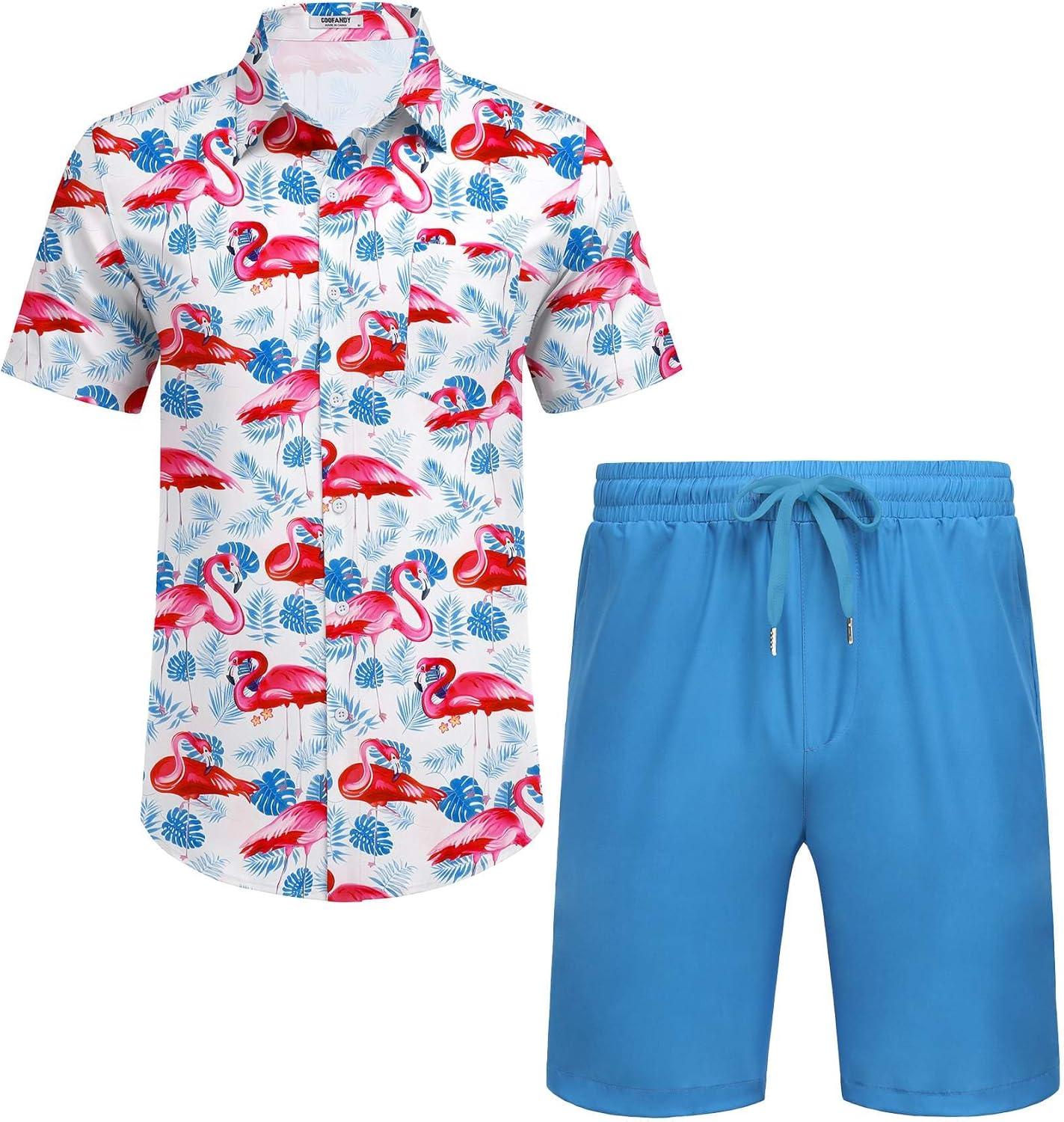 COOFANDY Men's 2 Piece Summer Beach Outfits Tropical Short Sleeve Button Down Shirts and Shorts Hawaiian Vacation Sets(Pink Blue Leaf)