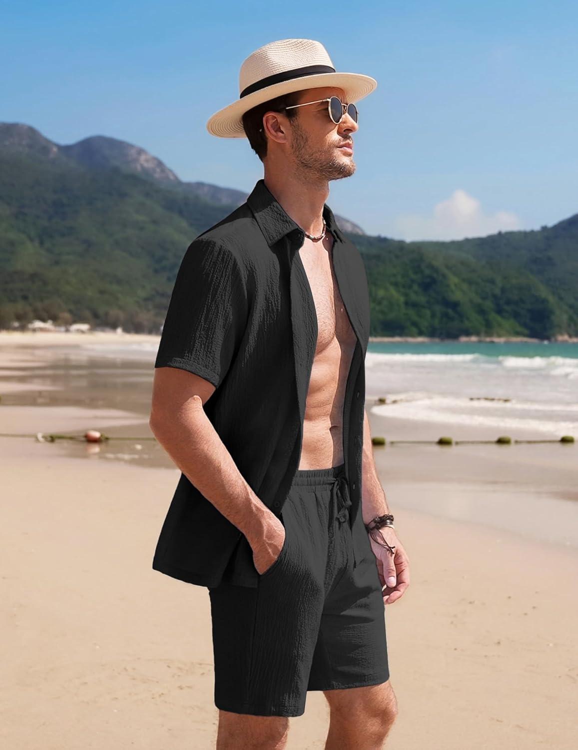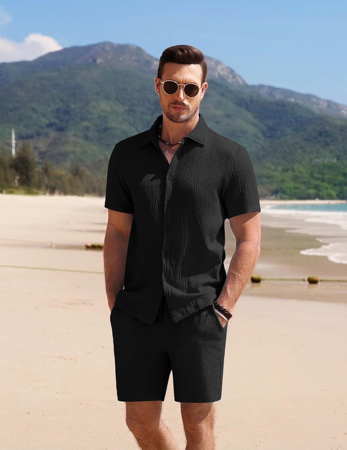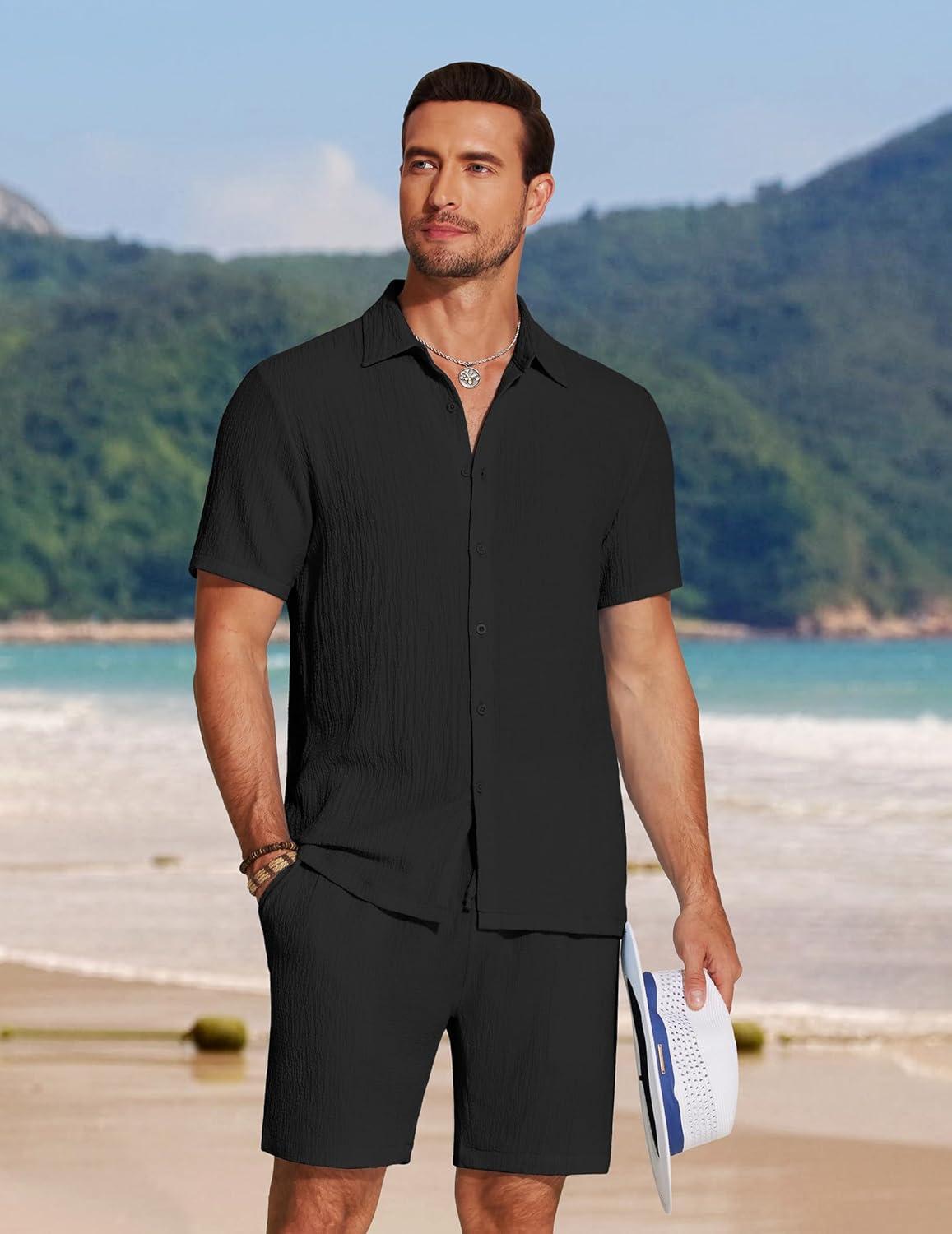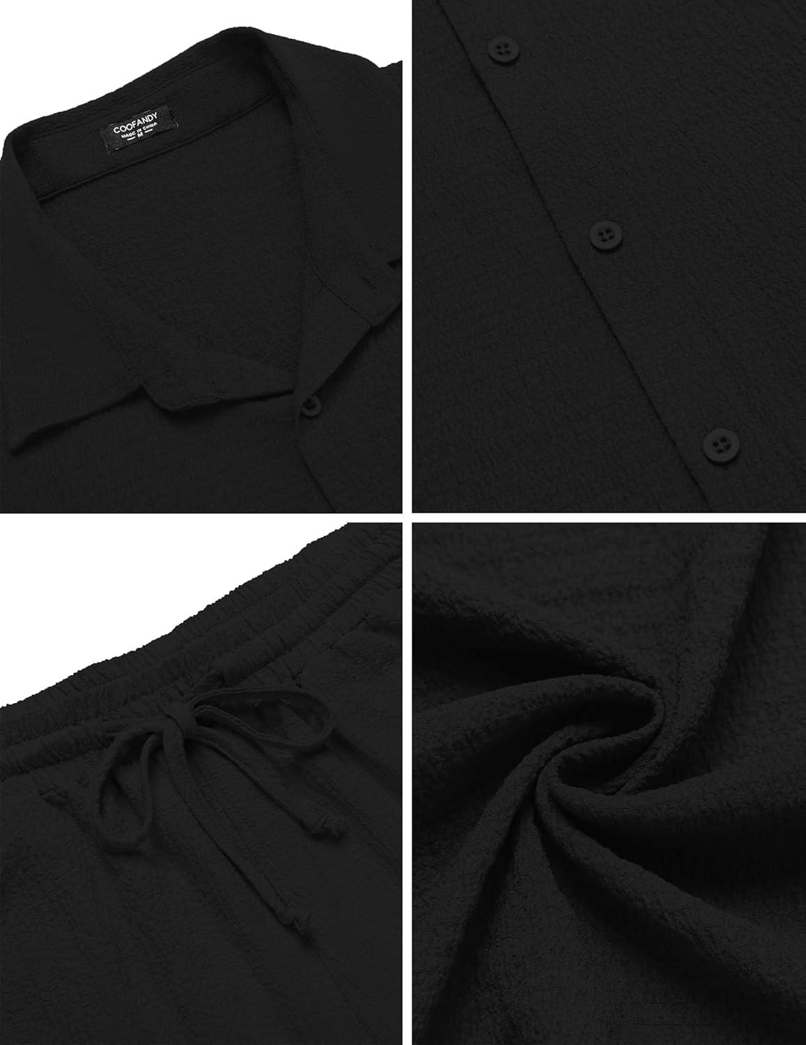 COOFANDY Men's 2 Piece Textured Outfits Beach Button Down Short Sleeve Shirt and Short Sets(Black)