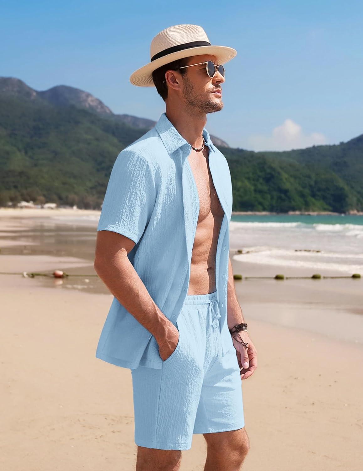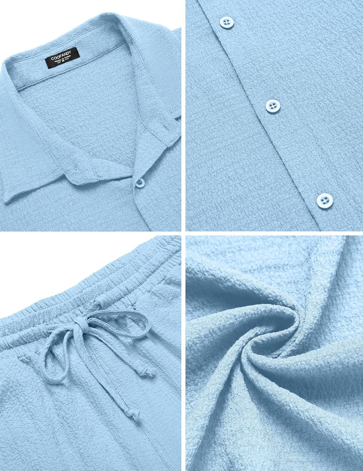 COOFANDY Men’s 2 Piece Textured Outfits Beach Button Down Short Sleeve Shirt and Short Sets(Light Blue)