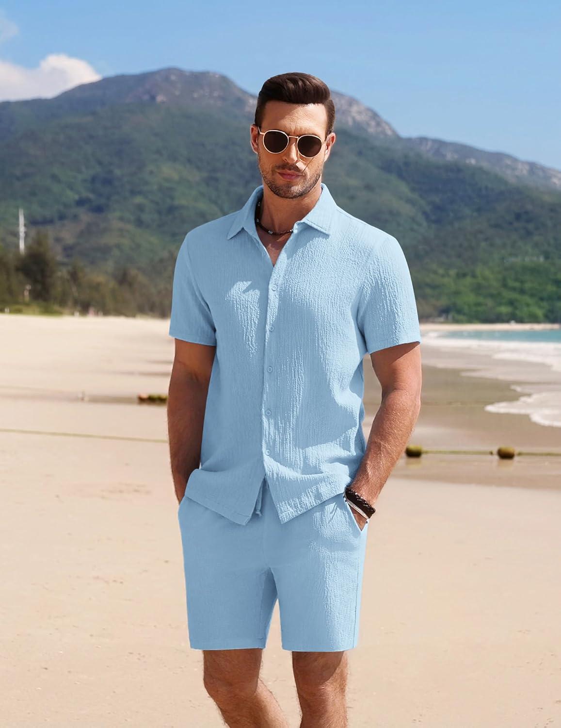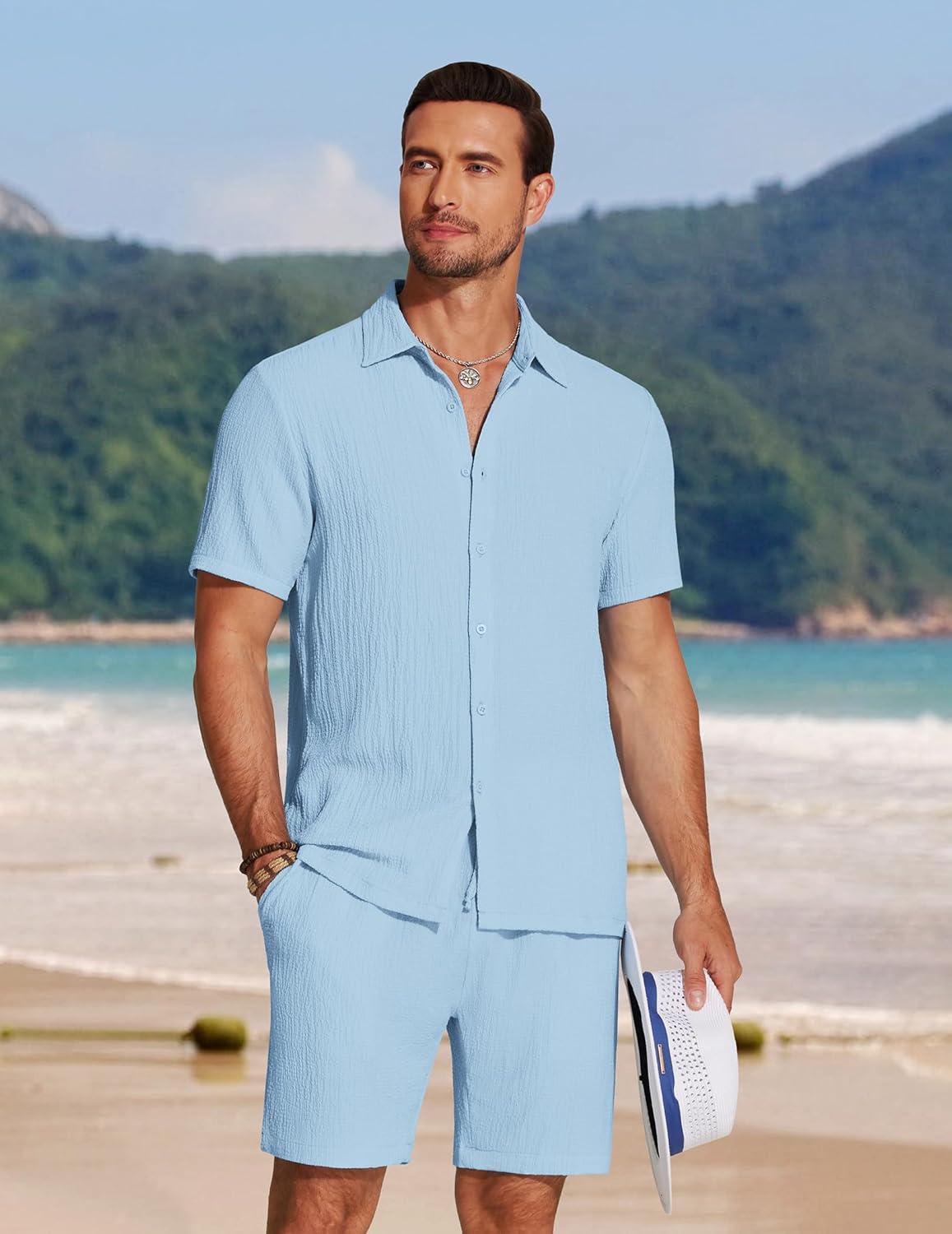 COOFANDY Men's 2 Piece Textured Outfits Beach Button Down Short Sleeve Shirt and Short Sets(Light Blue)