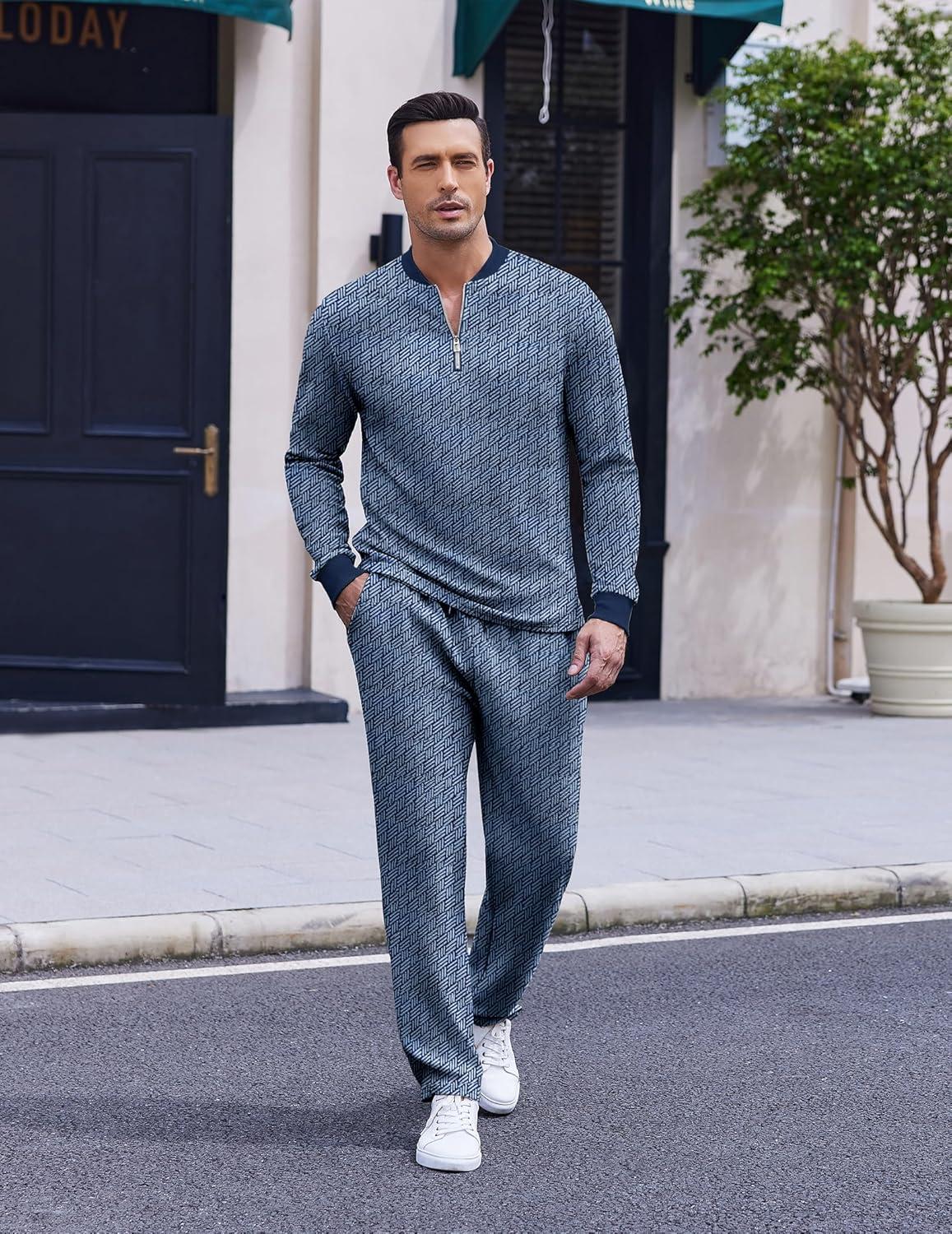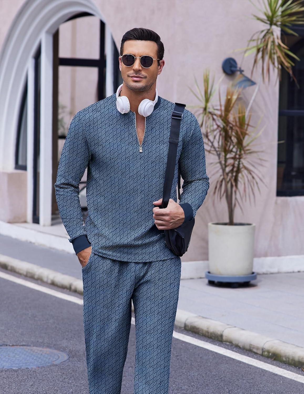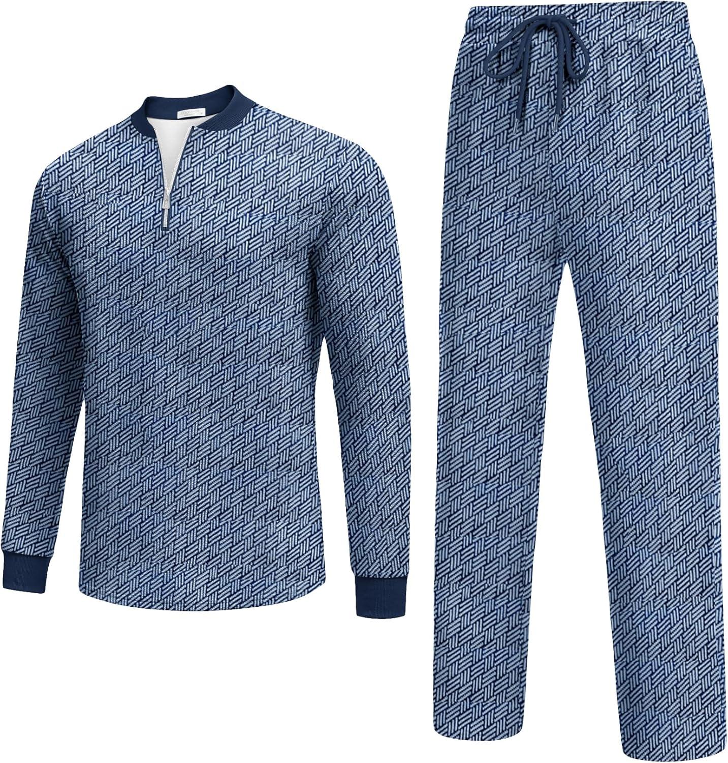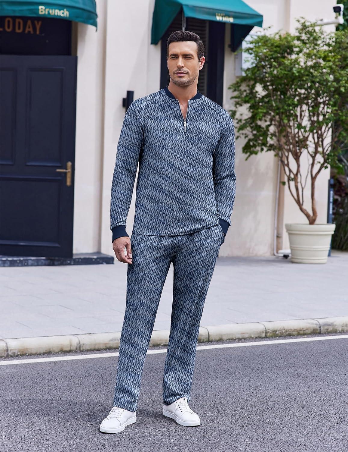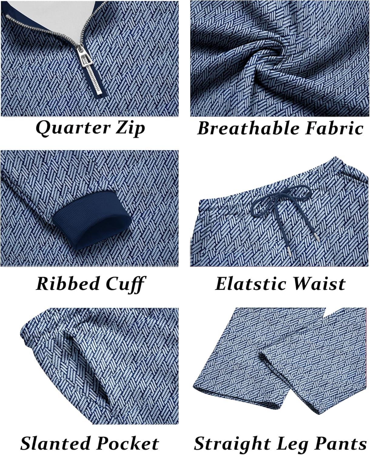 COOFANDY Men's 2 Piece Tracksuit Set Polo Athletic Sweatsuit Quarter Zip Jogging Long Sleeve Casual Sports Outfits(Navy Blue Jacquard)