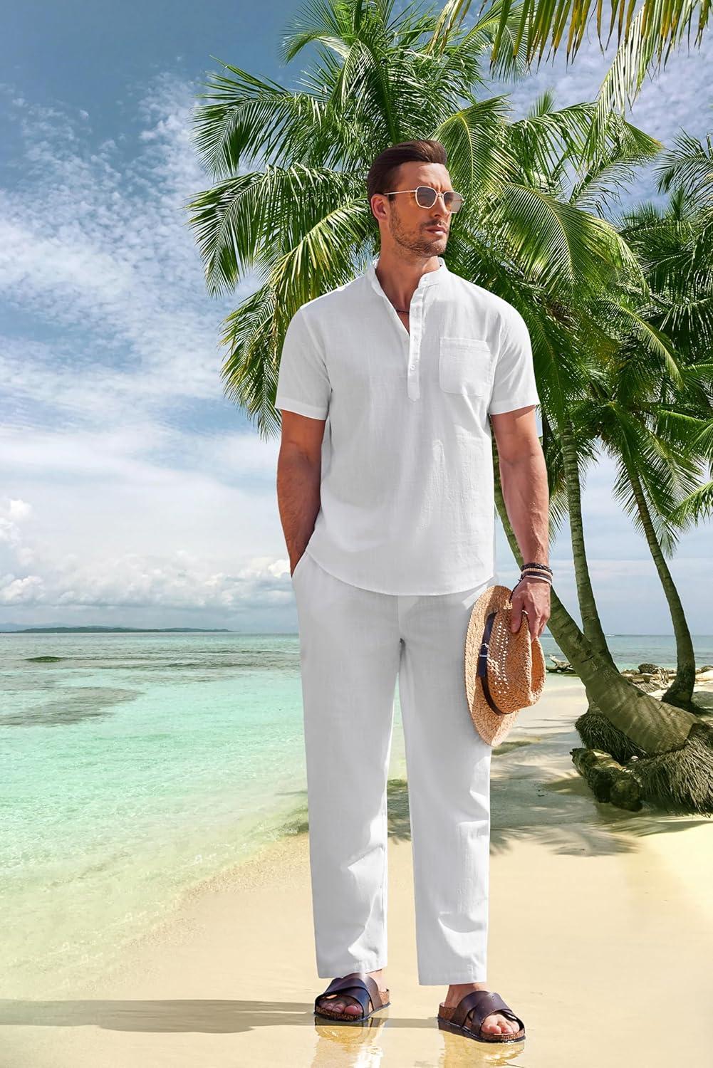 COOFANDY Men’s 2 Pieces Cotton Linen Set Casual Short Sleeve Henley Shirts Beach Yoga Pants Summer Outfits(All White)