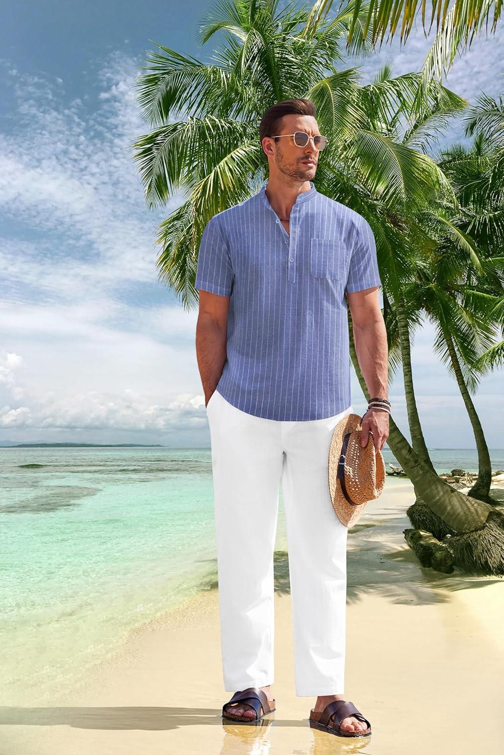 COOFANDY Men’s 2 Pieces Cotton Linen Set Casual Short Sleeve Henley Shirts Beach Yoga Pants Summer Outfits(Blue Striped)