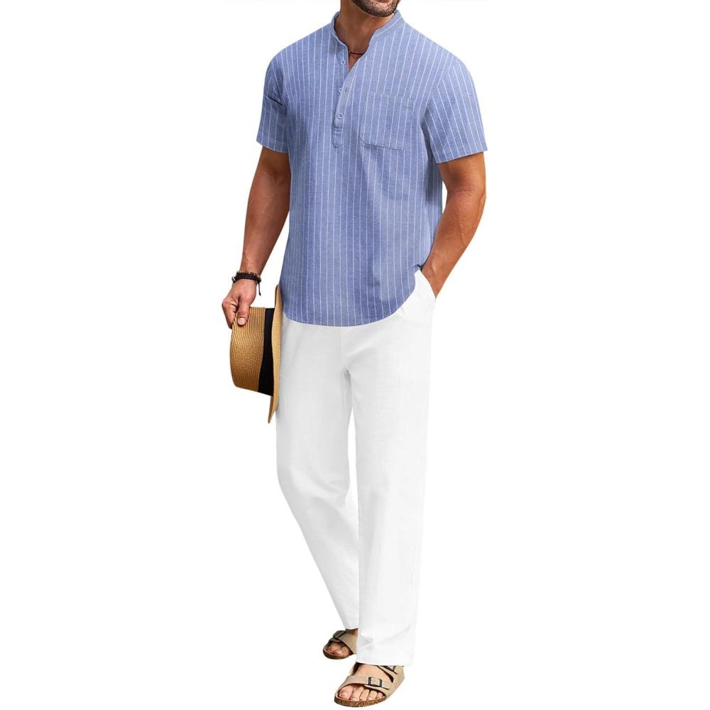 COOFANDY Men's 2 Pieces Cotton Linen Set Casual Short Sleeve Henley Shirts Beach Yoga Pants Summer Outfits(Blue Striped)