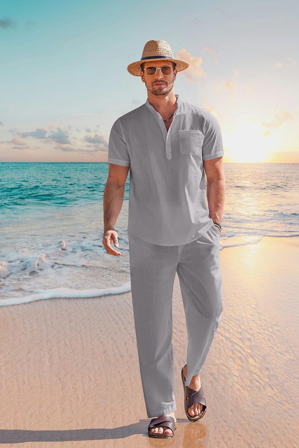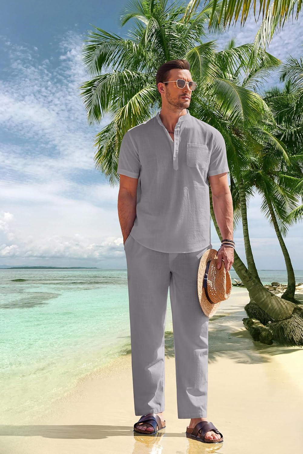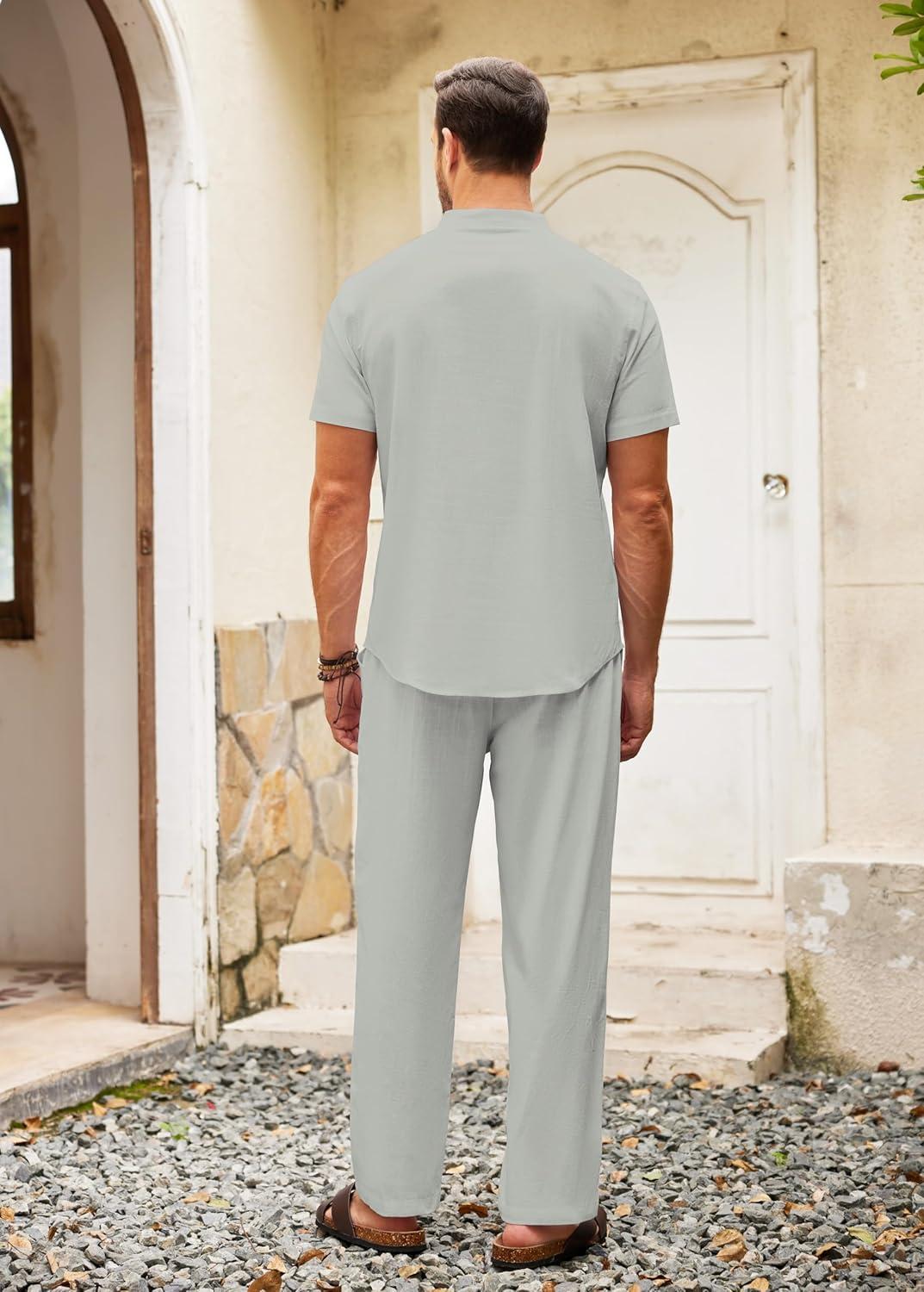 COOFANDY Men’s 2 Pieces Cotton Linen Set Casual Short Sleeve Henley Shirts Beach Yoga Pants Summer Outfits(Grey)
