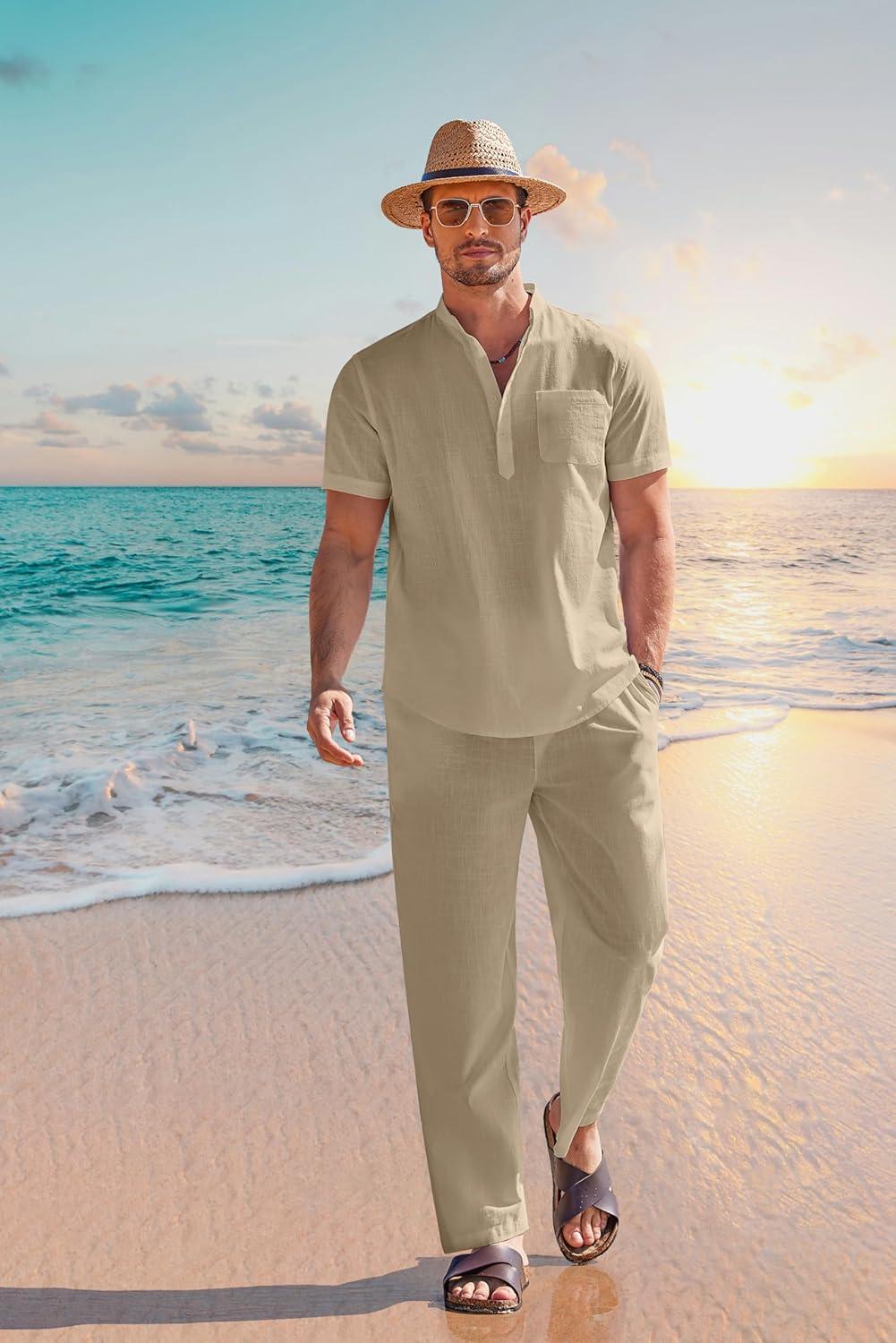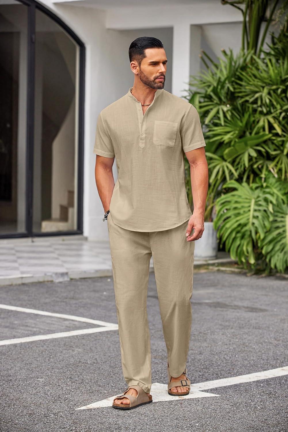 COOFANDY Men’s 2 Pieces Cotton Linen Set Casual Short Sleeve Henley Shirts Beach Yoga Pants Summer Outfits(Khaki)